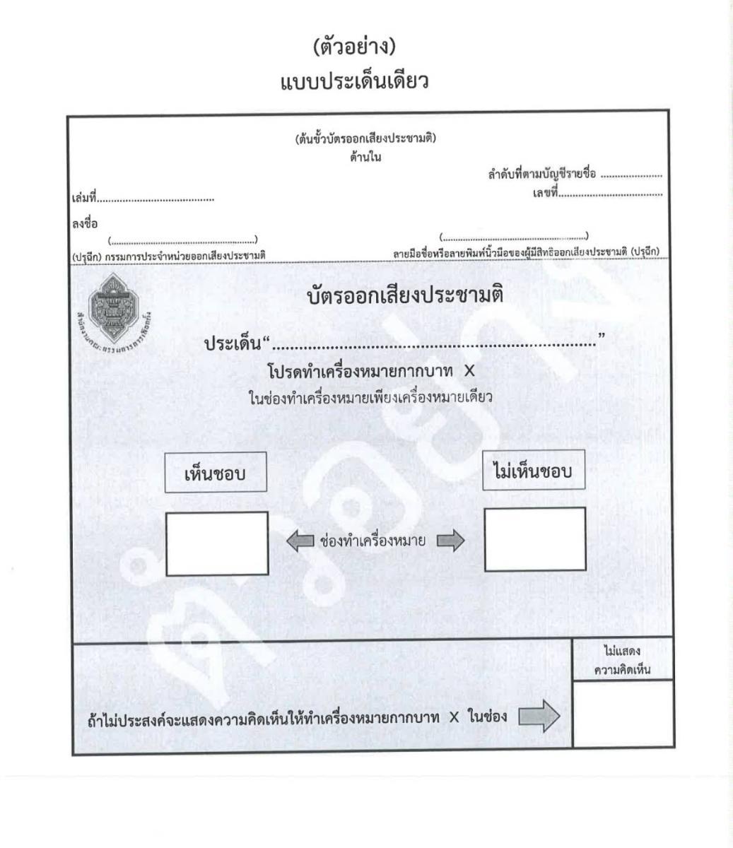 ข้อควรระวัง : ผู้ลงคะแนนต้องระมัดระวังไม่เขียนข้อความอื่นใดหรือทำสัญลักษณ์อื่นนอกเหนือจากที่กำหนดไว้ในบัตรเพื่อไม่ให้กลายเป็นบัตรเสีย