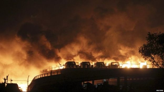 โดยเบื้องต้นนั้นทางนาย Matt Simon ผู้สื่อข่าวของสำนักข่าว CCTV America ได้รายงานข่าวเหตุการณ์นี้ว่าสาเหตุน่าจะเกิดขึ้นจากเกิดอุบัติเหตุเพลิงไหม้รถบรรทุกที่ขนสารเคมีที่กำลังขนย้าย ส่งผลให้เกิดเหตุการณ์ระเบิดอย่างรุนแรงจนทำให้เกิดเหตุระเบิดต่อเนื่องขึ้นเป็นลูกโซ่ ซึ่งแรงระเบิดระรอกแรกส่งผลให้ความรู้สึกเหมือนเกิดแผ่นดินไหวขนาด 2.3 แมกนิจูดหรือเทียบเท่าระเบิด TNT ขนาด 3 ตัน และการระเบิดระรอกที่ 2 ให้ความรู้สึกเหมือนแผ่นดินไหวขนาด 2.9 แมกนิจูดหรือเทียบเท่าระเบิด TNT ขนาด 21 ตัน ซึ่งสามารถทำให้ตึกมากมายในรัศมี 10 กิโลเมตรถล่มลงมา