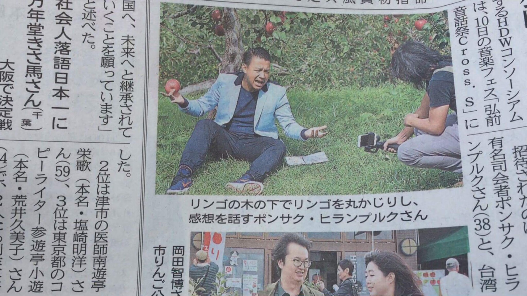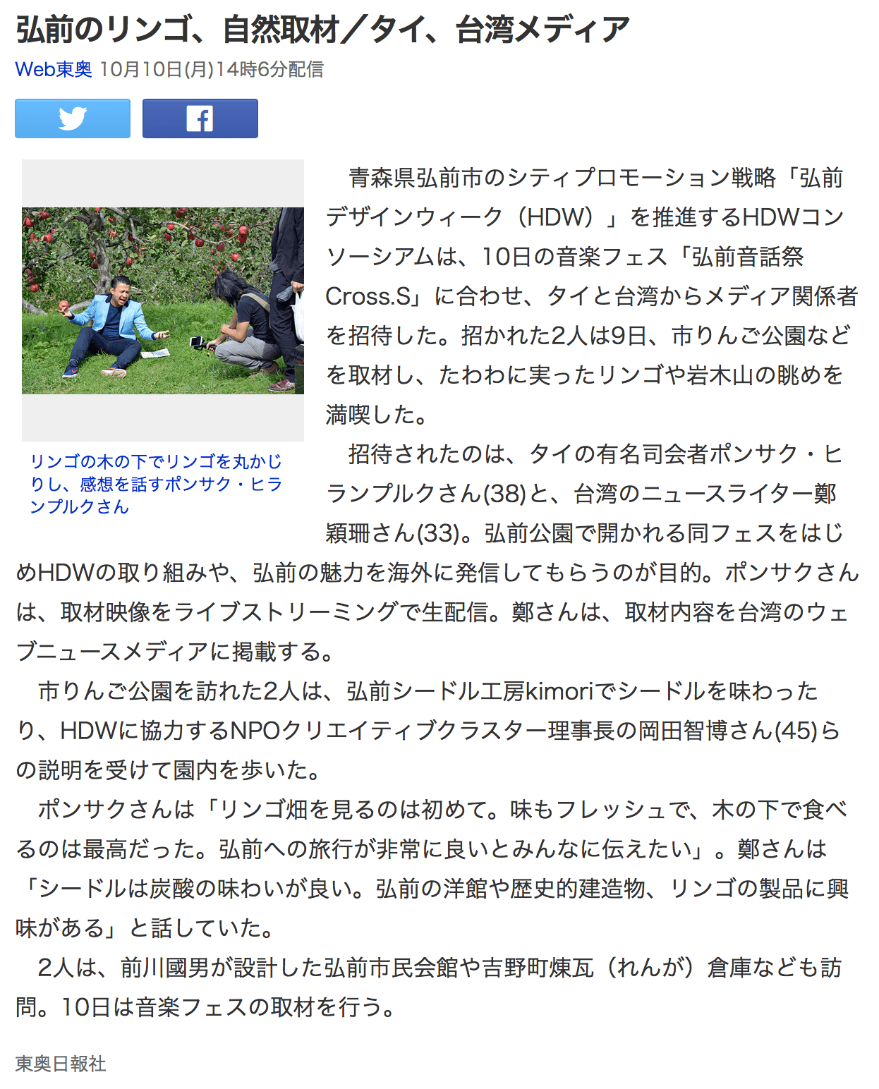 “พิธีกรชื่อดังของไทยกับเหล่านักเขียนชาวไต้หวันได้เดินทางไปทำข่าวเกี่ยวกับแอปเปิ้ลที่สวนฮิโรซากิ และงาน Hirosaki Design Week โดยพูดถึง พงซากุ หิรัญปุรุกุ-ซัง (คุณพงศ์สุข หิรัญพฤกษ์) ว่าเขากำลังกล่าวถึงแอปเปิ้ลของสวนแอปเปิ้ลนี้ว่ามีรสชาติมันสดชื่นมากๆ และการได้กินแอบเปิ้ลใต้ต้นมันนี่สุโค่ยจริง ๆ จึงอยากเล่าเรื่องดี ๆ นี้ให้ทุกคนฟัง
