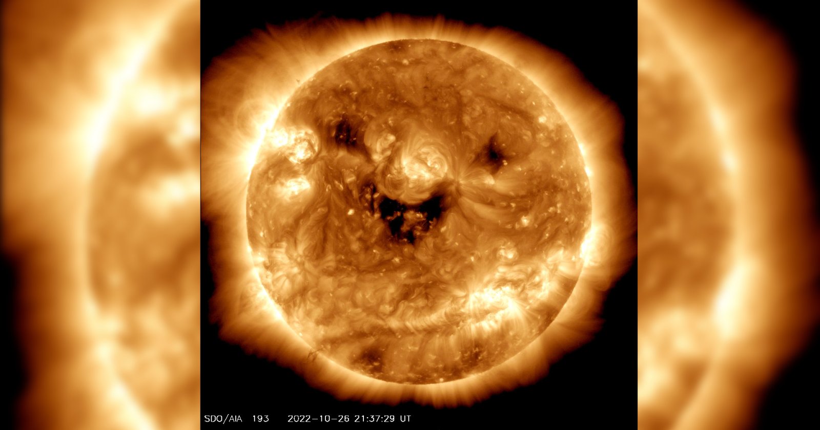 31/10/2022สัปดาห์ที่ผ่านมานาซ่า (NASA) เพิ่งเปิดตัวภาพใหม่ของ Eagle Nebula ที่ถ่ายโดยกล้องโทรทรรศน์อวกาศเจมส์ เวบบ์ โดยบังเอิญ Solar Dynamics Observatory ของนาซ่าสามารถจับภาพดวงอาทิตย์ที่น่ากลัวได้เช่นเดียวกัน โดยมีหลุมโคโรนา (coronal holes) สามจุดใหญ่ที่อยู่ในตำแหน่งและมีลักษณะคล้ายดวงตาและปากกำลังส่งยิ้มอยู่