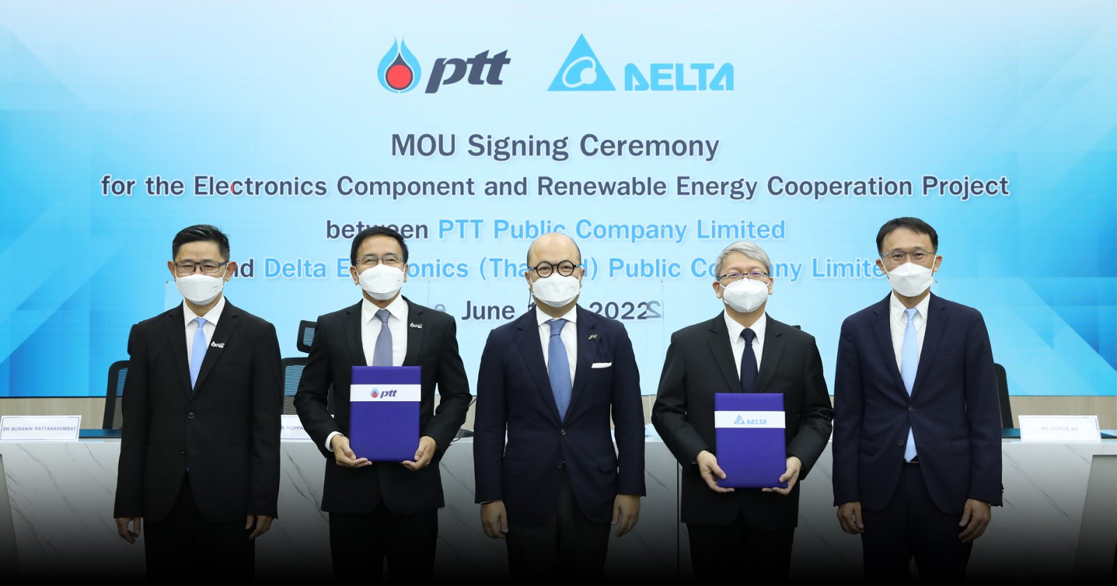 13/06/2022บริษัท ปตท. จำกัด (มหาชน) และ บริษัท เดลต้า อีเลคโทรนิคส์ (ประเทศไทย) จำกัด (มหาชน) ร่วมพิธีลงนามบันทึกข้อตกลงความร่วมมือการศึกษาและแสวงหาโอกาสทางธุรกิจด้านอุปกรณ์อิเล็กทรอนิกส์ และอุปกรณ์อิเล็กทรอนิกส์ที่เกี่ยวข้องกับอุตสาหกรรมยานยนต์ไฟฟ้า ระบบนิเวศ อุปกรณ์ และแบตเตอร์รี่สำหรับการชาร์จรถยนต์ไฟฟ้า