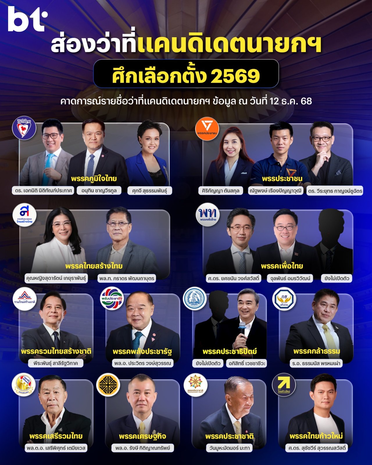 เริ่มกันที่พรรคภูมิใจไทย พรรคของนายกคนล่าสุด ซึ่งได้มีการเปิดตัวแคนดิเดตนายกแบบกึ่งทางการผ่านการให้สัมภาษณ์กับสื่อมวลชน ณ ตึกไทยคู่ฟ้า เมื่อ 10 พฤศจิกายน 2568 โดยมีรายชื่อแคนดิเดตนายกคือ อนุทิน ชาญวีรกูล แคนดิเดตนายกลำดับที่ 1, ดร. เอกนิติ นิติทัณฑ์ประภาศ แคนดิเดตนายกลำดับที่ 2, และศุภจี สุธรรมพันธุ์ แคนดิเดตนายกลำดับที่ 3