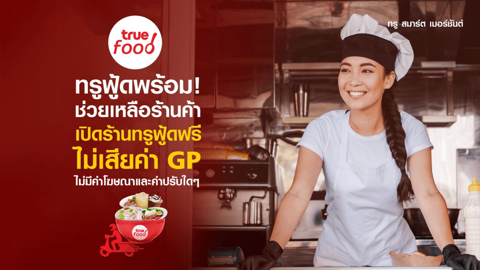 30/07/2021จากการยกระดับมาตรการป้องกันการแพร่ระบาดของโควิด-19 ในเขตพื้นที่ควบคุมสูงสุดและเข้มงวด…ทรูฟู้ด บริการฟู้ดเดลิเวอรี่จากทรู ขอเคียงข้างสู้โควิดไปกับพ่อค้าแม่ค้า พร้อมสนับสนุนผู้ประกอบการ และดูแลร้านอาหารให้มีออเดอร์ในช่วงมาตรการล็อกดาวน์ โดยช่วยเพิ่มช่องทางในการสร้างโอกาสการขายและเพิ่มรายได้ เพียงสมัครเป็นสมาชิก ทรู สมาร์ต เมอร์ชันต์ ก็สามารถเปิดร้านผ่านทรูฟู้ดบนแอปพลิเคชันทรูไอดี ได้ฟรี! ไม่เสียค่าสมัคร และไม่เก็บค่าธรรมเนียม (GP) ตั้งแต่วันนี้ ถึง 31 ธันวาคม…