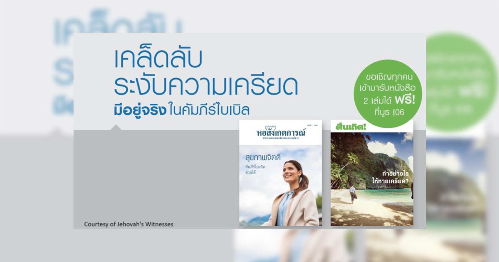 วันที่ 28 มีนาคม – 8 เมษายน 2024 ในงานสัปดาห์หนังสือแห่งชาติครั้งที่ 52 ที่ศูนย์การประชุมแห่งชาติสิริกิติ์ พยานพระยะโฮวาร่วมกับมูลนิธิส่งเสริมการศึกษาพระคัมภีร์ จะมีส่วนร่วมในการแจกจ่ายหนังสือ 2 เล่มที่มีคำแนะนำดีๆจากคัมภีร์ไบเบิลซึ่งช่วยให้ผู้คนมีความสุขมากขึ้น