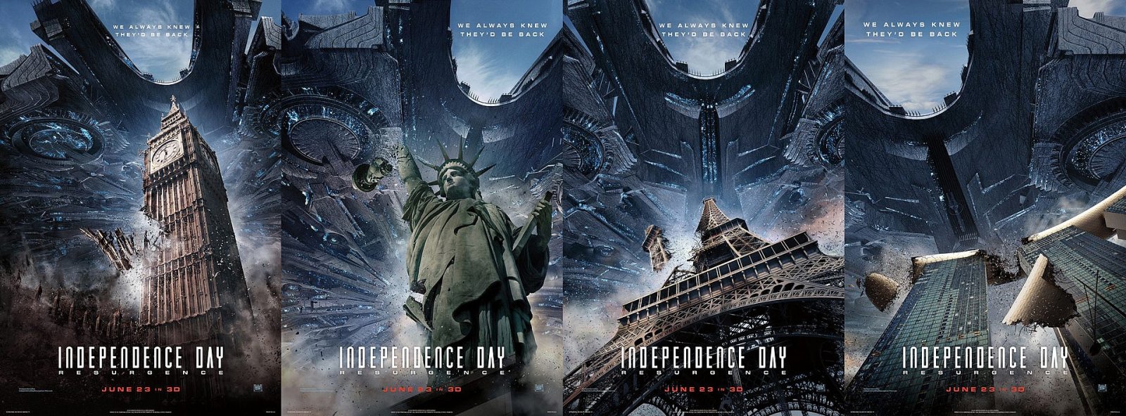 25/05/2016เปิดตัวใบปิดใหม่ เมื่อ 4 แลนด์มาร์คสำคัญทั่วโลกถูกโจมตี จากผู้รุกรานนอกโลก และตัวอย่างที่ 3 รอบนี้ให้ดูกันจุใจลากยาวเกือบ 5 นาที โชว์ฉากซีจีในระดับอลังการ ได้เห็นดาราจากภาคแรกกลับมากันเกือบครบ ขาดเพียง วิล สมิธ เรื่องราวภาคนี้ เล่าเหตุการณ์เมื่อโลกถูกรุกรานอีกครั้งจากมนุษย์ต่างดาว หลังจากชาวโลกเอาชนะมันไปเมื่อ 20 ปีที่แล้ว…