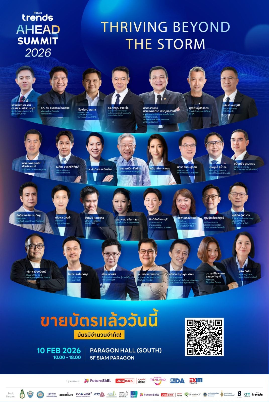 ความพิเศษของงานในปีนี้คือการถอดรหัสเนื้อหาอันเข้มข้นมาจากหนังสือ ‘Future Trends Ahead 2026 Presented by FutureSkill’ มาขยายความบนเวทีจริง เพื่อให้ผู้เข้าร่วมงานได้เห็นภาพอนาคตที่ชัดเจนยิ่งขึ้น โดยเป็นการผนึกกำลังครั้งสำคัญของสถาบันวิจัยชั้นนำระดับประเทศและระดับโลกกว่า 14 แห่ง