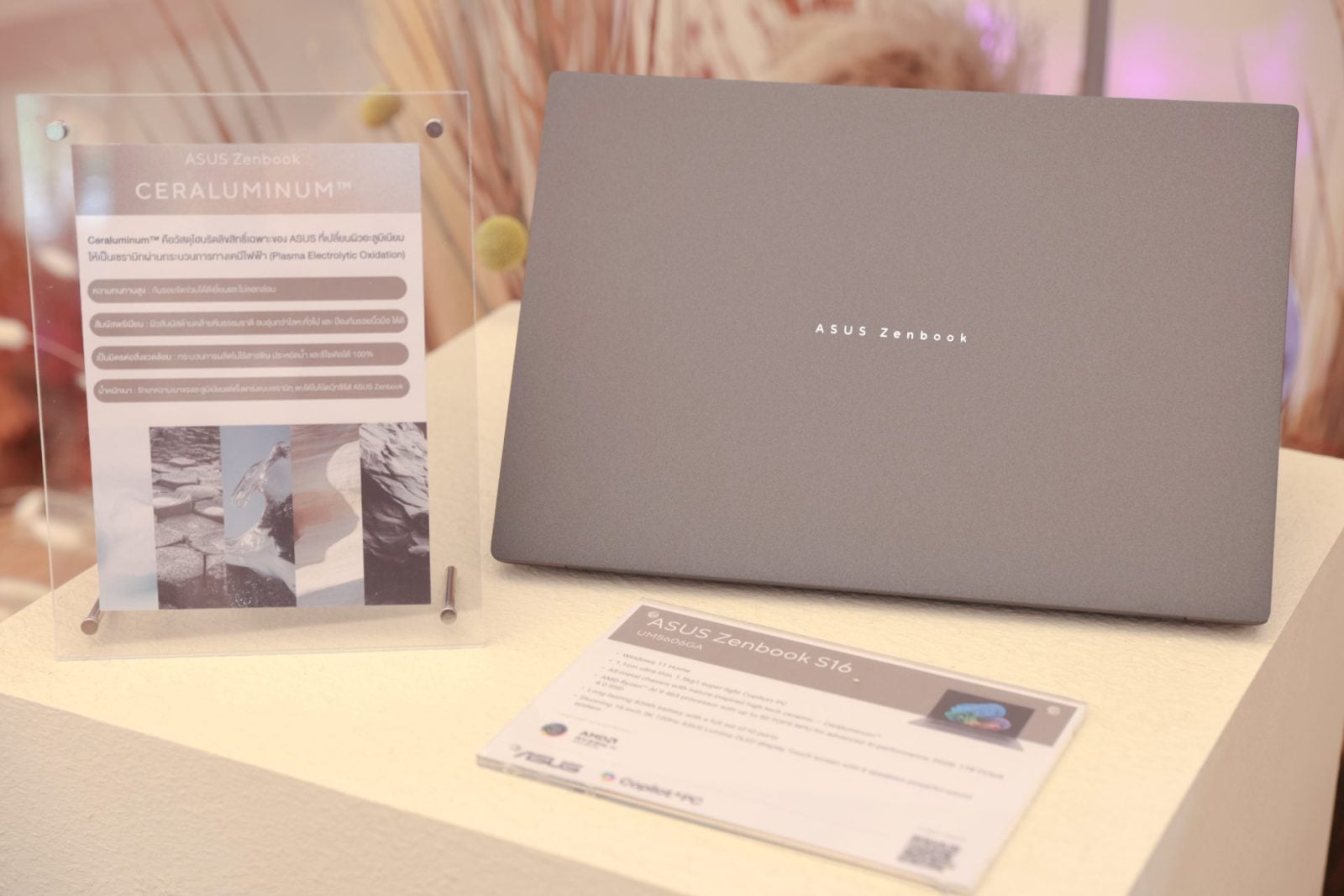 เริ่มต้นด้วยพี่ใหญ่อย่าง ASUS Zenbook S16 (UM5606GA) ที่รอบนี้มาพร้อมดีไซน์ใหม่ล่าสุดในสีเทา Antrim Gray จุดเด่นคือการใช้เทคโนโลยีวัสดุ เซราลูมิเนียม (Ceraluminum) ซึ่งเป็นการนำข้อดีของเซรามิกที่ให้สัมผัสพรีเมียมและไม่เป็นรอยนิ้วมือ มารวมเข้ากับความแข็งแกร่งของอะลูมิเนียม ตัวเครื่องมีความบางเพียง 1.1 เซนติเมตร และน้ำหนักเบาเพียง 1.5 กิโลกรัม