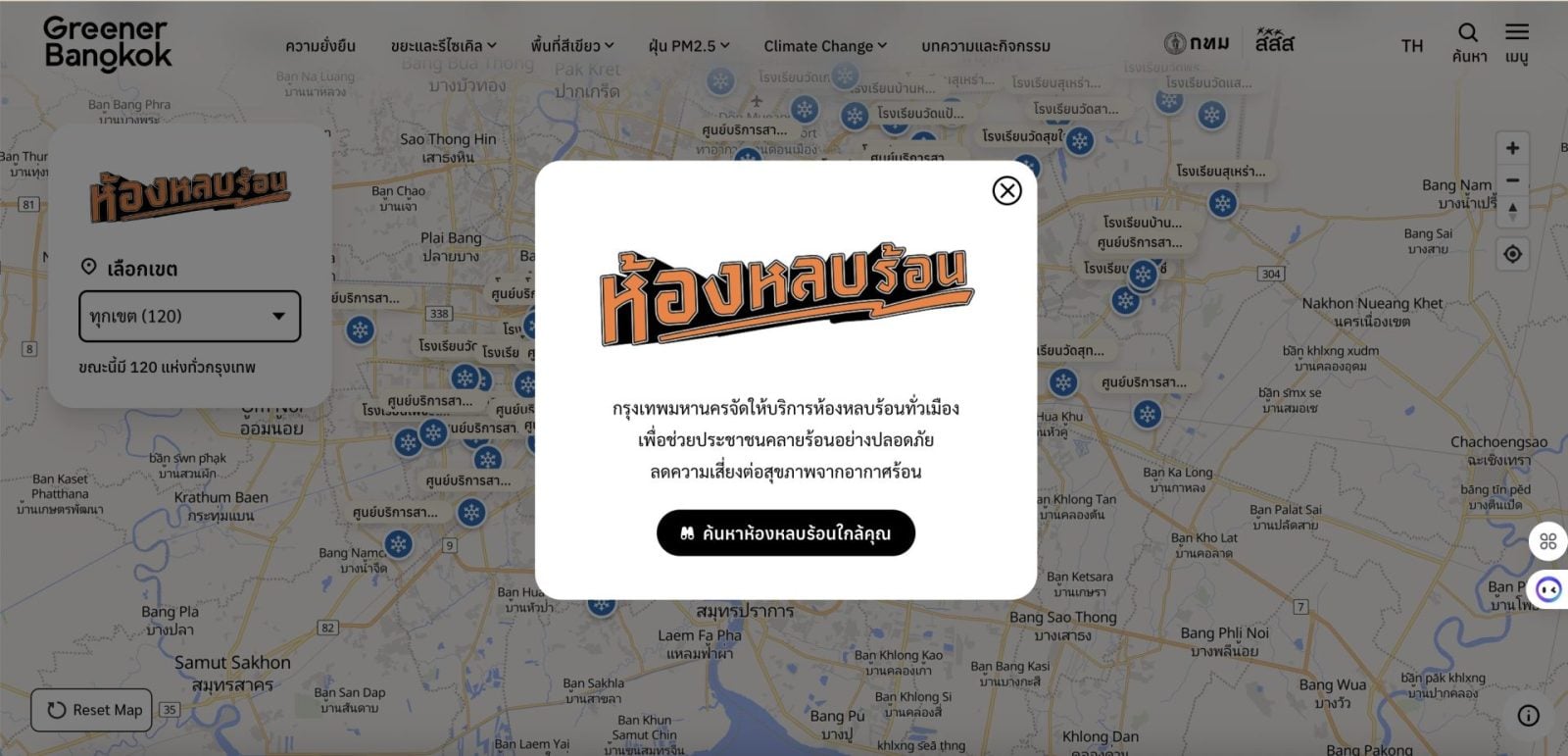 ประชาชนสามารถเช็กพิกัดห้องหลบร้อนที่ใกล้ที่สุดผ่านระบบแผนที่ GIS (Geographic Information System) ได้ทันทีที่ greener.bangkok.go.th/heat-escape-room/