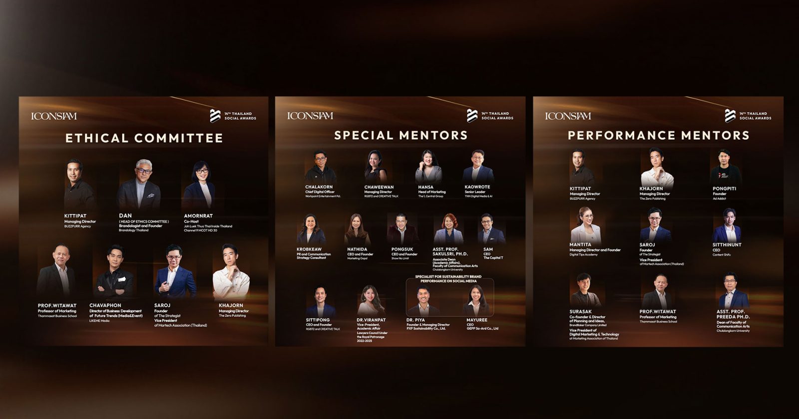 คุณกรอบแก้ว ปันยารชุน ที่ปรึกษาด้านการวางแผนกลยุทธ์ภาพลักษณ์เเละการสื่อสาร, คุณก้าวโรจน์ สุตาภักดี Senior Leader TNN Digital Media & AI, คุณฉวีวรรณ คงโชคสมัย Managing Director บริษัท RGB72 และ CREATIVE TALK, คุณชลากรณ์ ปัญญาโฉม ประธานเจ้าหน้าที่บริหารสายงานดิจิทัล บริษัทเวิร์คพอยท์ เอ็นเทอร์เทนเมนท์ จำกัด (มหาชน), คุณแซม ตันสกุล CEO บริษัท The Capital T, คุณณธิดา รัฐธนาวุฒิ CEO and Founder บริษัท Marketing Oops!, คุณพงศ์สุข หิรัญพฤกษ์ ประธานกรรมการบริหาร บริษัท โชว์ไร้ขีด จำกัด, คุณมยุรี อรุณวรานนท์ CEO บริษัท GEPP Sa-Ard, คุณสิทธิพงศ์ ศิริมาศเกษม CEO and Founder บริษัท RGB72 และ CREATIVE TALK, คุณหรรษา วงศ์สิริพิทักษ์ Head of Marketing – The 1, Central Group, ดร. วิรัลพัชร เวธทาวริทธิ์ธร Vice-President, Academic Affair- Lawyers Council Under the Royal Patronage, ผศ.ดร. สกุลศรี ศรีสารคาม รองคณบดีด้านวิชาการ คณะนิเทศศาสตร์ จุฬาลงกรณ์มหาวิทยาลัย, ดร. ปิยะ เกิดลาภ Founder and Managing Director บริษัท PXP Sustainability