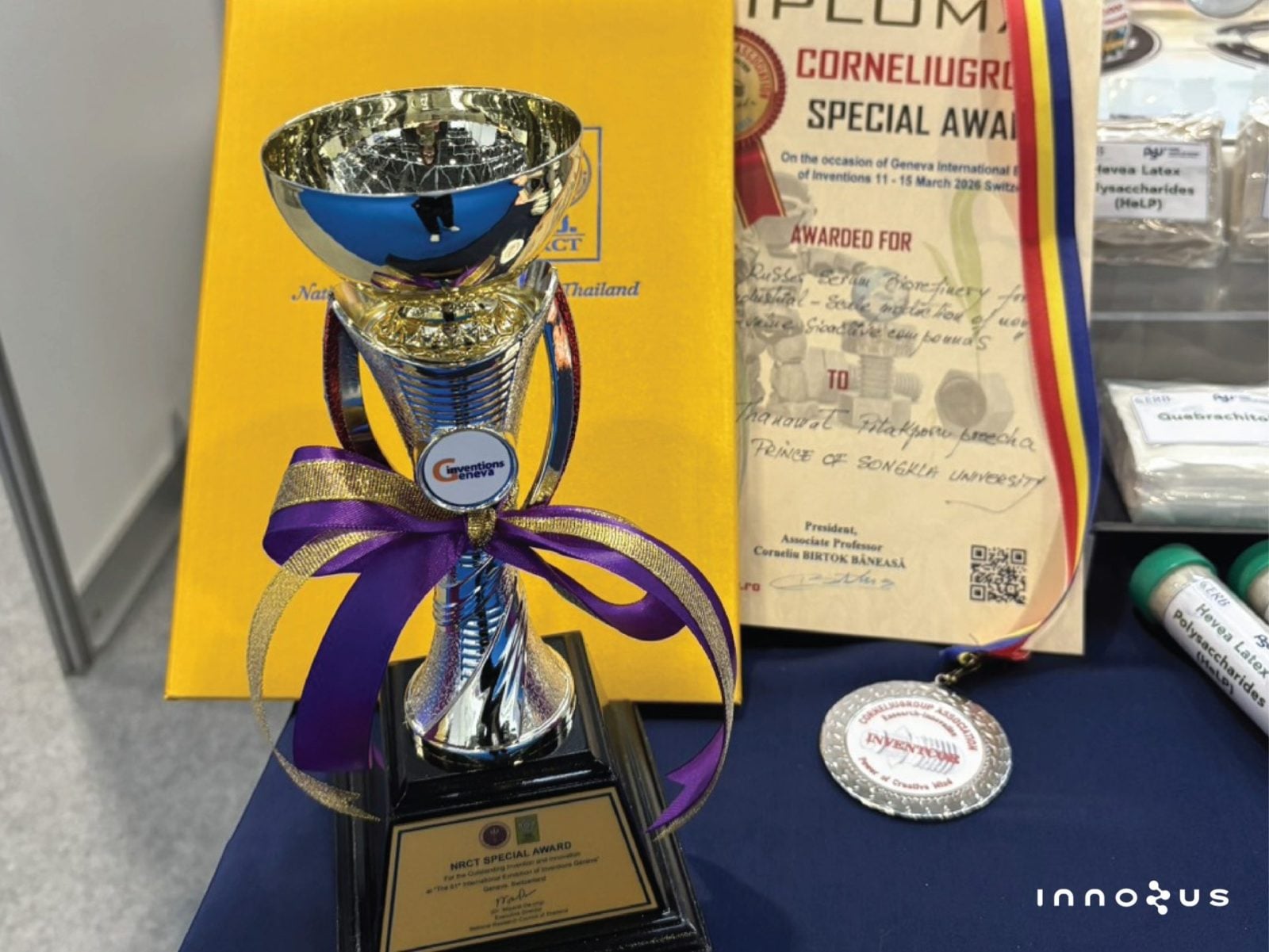 ล่าสุดทีมนักวิจัยที่ศึกษาการสกัดสารจากเซรั่มยางพาราได้คว้ารางวัลสูงสุด Gold Medal with Congratulations of Jury (เหรียญทองเกียรติยศ) พร้อมรางวัลสำคัญอื่น ๆ อีก 2 รางวัล จากเวที “The 51st International Exhibition of Inventions Geneva” ซึ่งเป็นเวทีที่รวบรวมนวัตกรรมชั้นยอดจากนักประดิษฐ์และองค์กรชั้นนำทั่วโลกนับพันรายการที่เก่าแก่ที่สุดงานหนึ่งของโลก ณ กรุงเจนีวา สมาพันธรัฐสวิส
