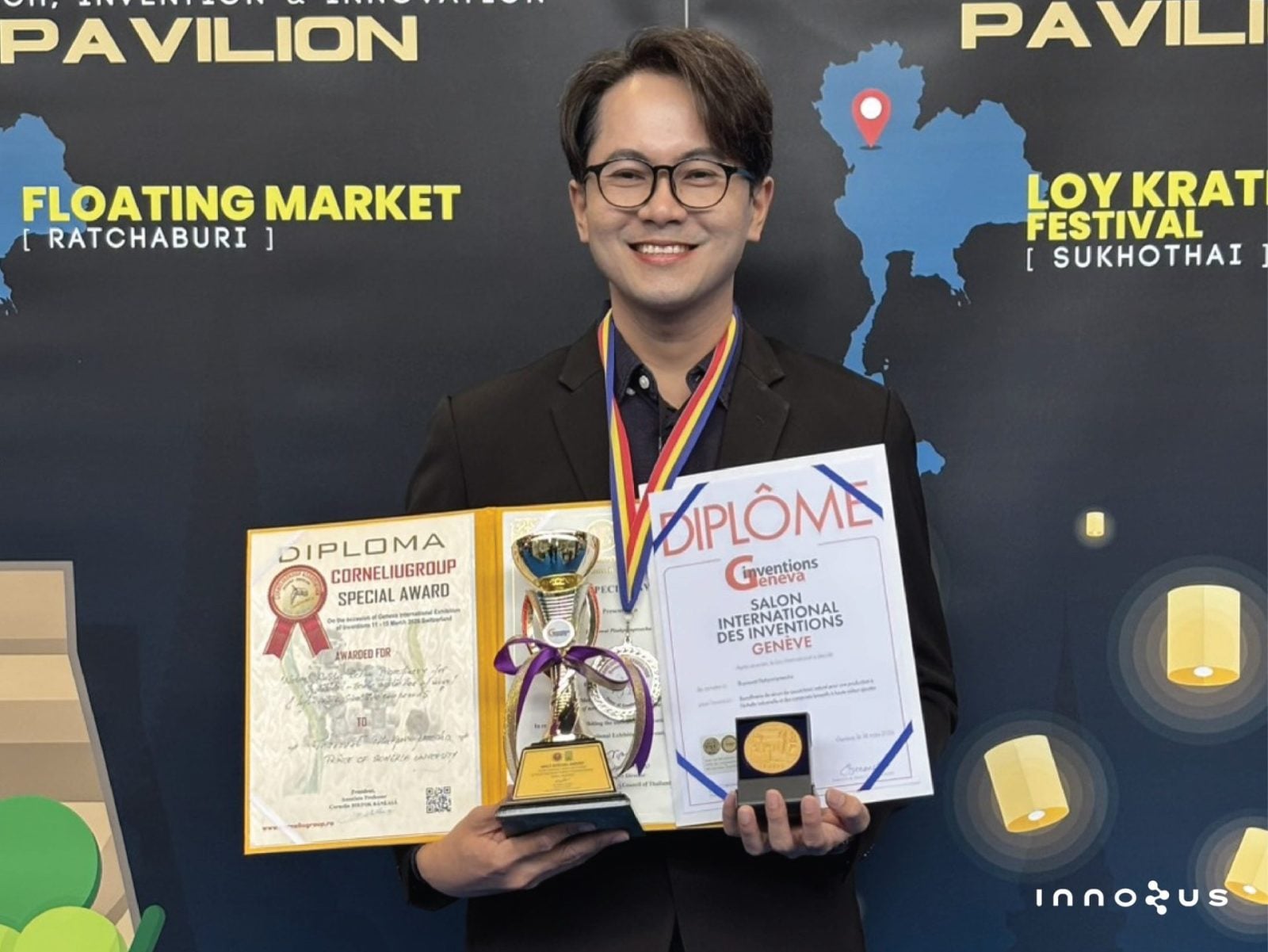 ดร. นำโชค โสมาภา ประธานเจ้าหน้าที่บริหาร บริษัท อินโนซุส จำกัด ได้เปิดเผยเรื่องราวความภาคภูมิใจนี้ผ่านโซเชียลมีเดียส่วนตัว ถึงความสำเร็จของผลงานวิจัยเรื่อง “Natural Rubber Serum Biorefinery for industrial-scale production of novel & high-value bioactive compounds”