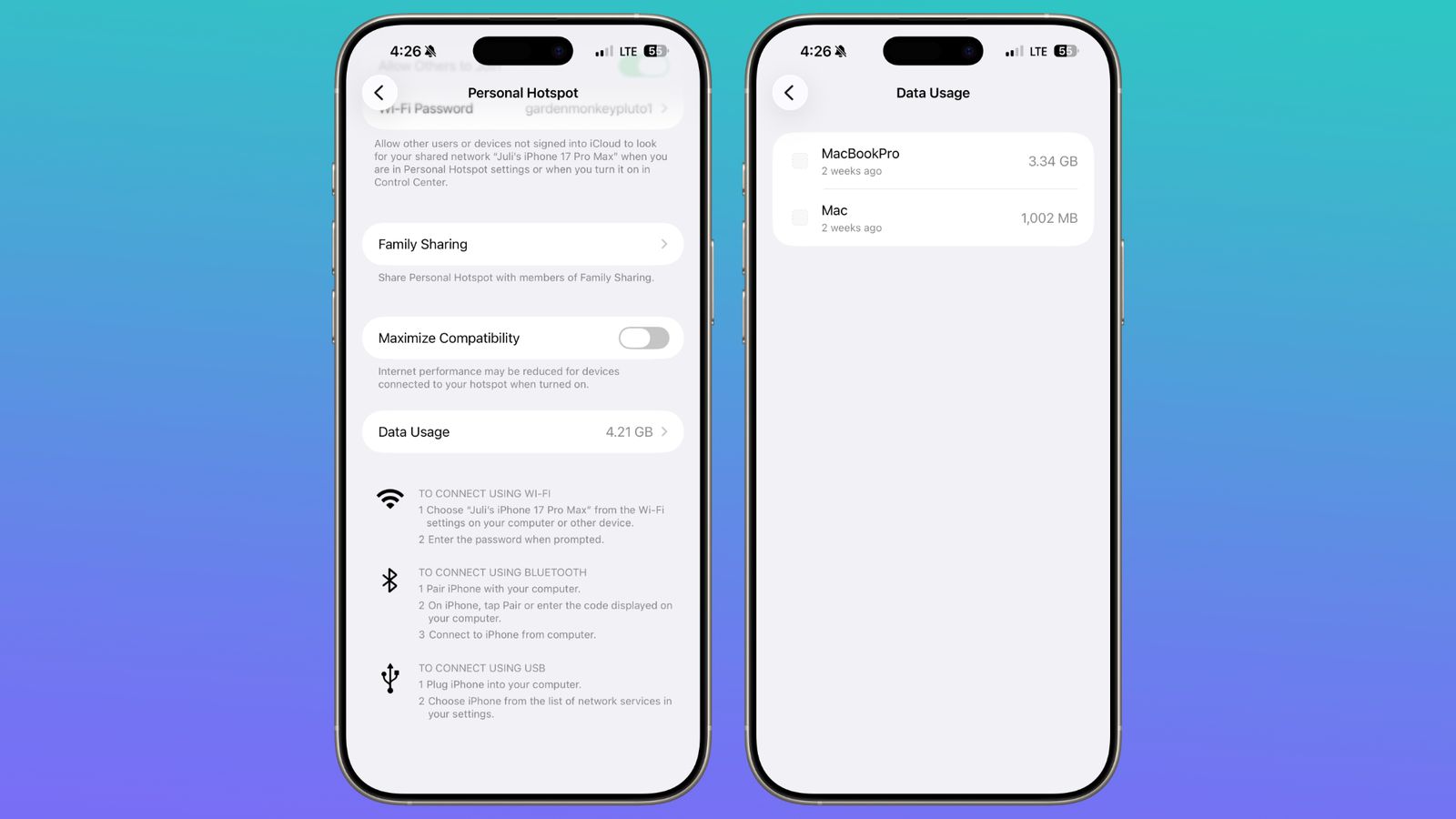 Apple ได้ย้ายตำแหน่งการแสดงปริมาณการใช้ข้อมูลฮอตสปอตใหม่ แทนที่จะซ่อนไว้ในหมวดเซลลูลาร์ ตอนนี้เราจะเห็นปริมาณข้อมูลที่ใช้ไปได้โดยตรงในส่วนของฮอตสปอตส่วนบุคคลเลย