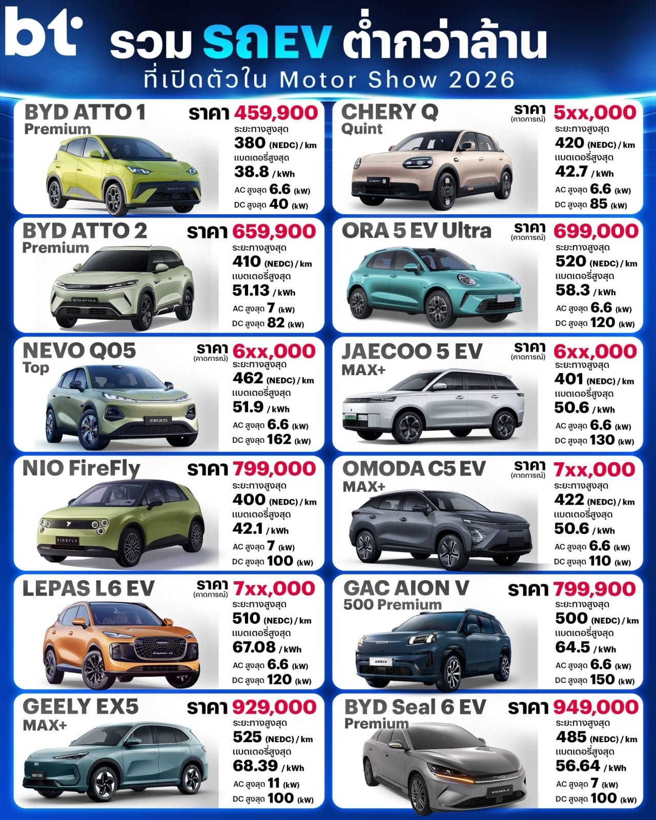 ตลาด EV ในงาน Motor Show ปี 2026 รอบนี้เดือดกว่าที่คิด โดยเฉพาะกลุ่มราคาต่ำกว่าหนึ่งล้านบาทที่มีตัวเลือกโผล่มาเพียบ ทั้งแบรนด์เจ้าตลาดและน้องใหม่ที่พยายามยัดสเปกมาสู้แบบไม่มีใครยอมใคร BT beartai สรุปข้อมูลตัวรถและตัวเลขสำคัญมาให้แบบเน้น ๆ เพื่อใช้ประกอบการตัดสินใจให้แล้ว