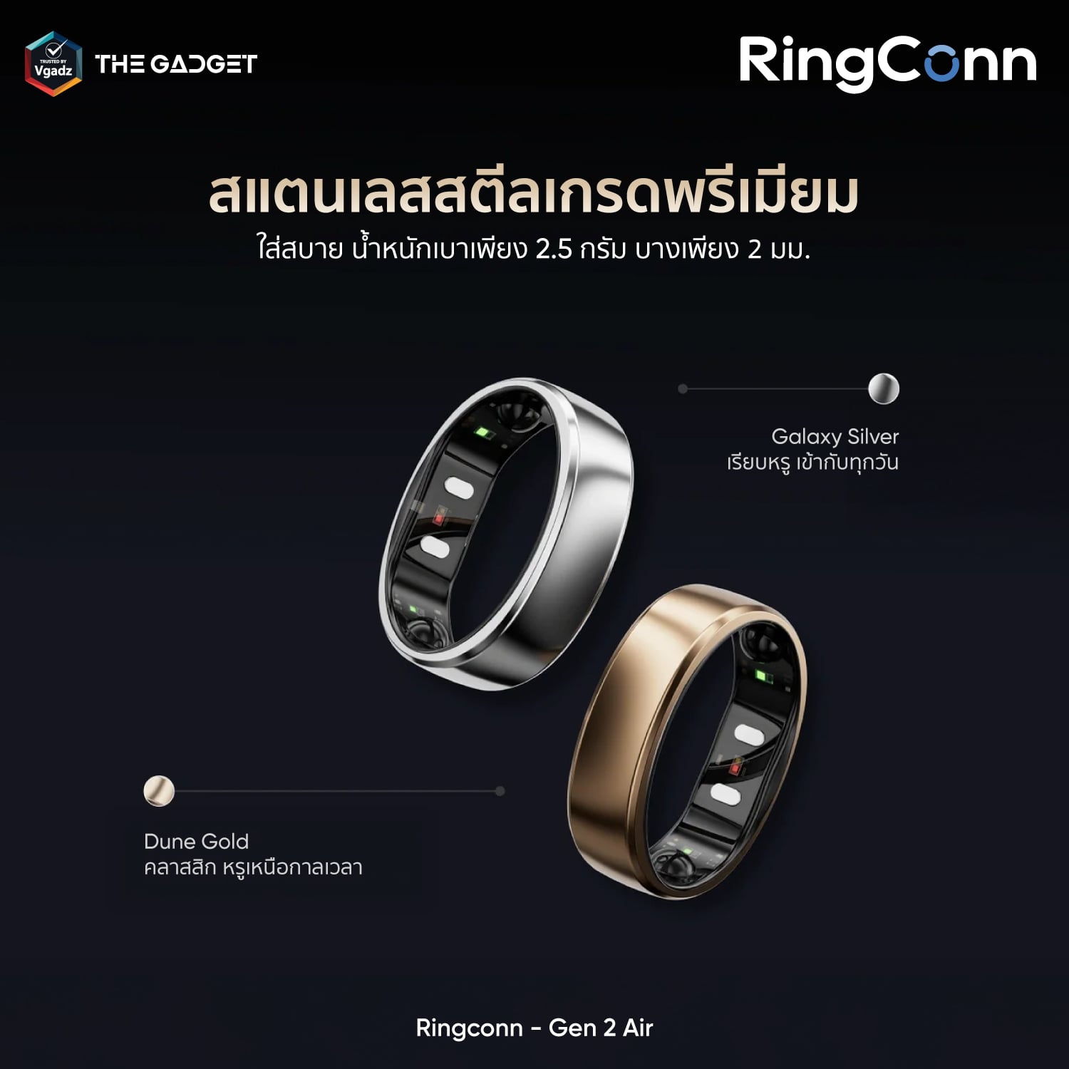 RingConn Gen 2 Air ถูกออกแบบมาเพื่อแก้ปัญหาความอึดอัดจากการสวมใส่ Smart Watch โดยเฉพาะรุ่นนี้มีความบางเพียง 2 มิลลิเมตร และน้ำหนักเบาสุดขีดเพียง 2.5 กรัม (ตามขนาดไซส์) ผลิตจากวัสดุ Stainless Steel เกรดพรีเมียมที่มีความทนทานและเป็นมิตรต่อผิวหนัง ทำให้สามารถสวมใส่เพื่อติดตามสุขภาพได้ตลอดทั้งวันและคืนโดยไม่รู้สึกรำคาญ