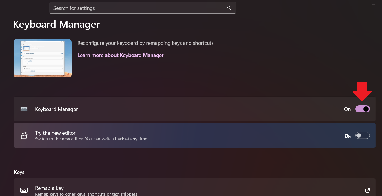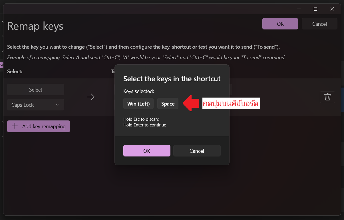 ให้เราเลือก “หัวข้อ Remap a key” เพื่อตั้งปุ่มเปลี่ยนภาษา แล้ว กดคำว่า + Add key remapping
