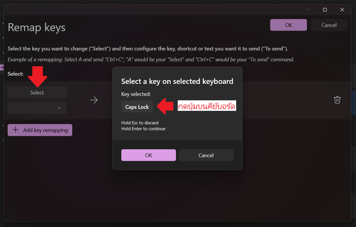 จากนั้นให้เรา “กดคำว่า Select ฝั่งซ้าย แล้วกดปุ่ม Caps Lock บนคีย์บอร์ด” (ถ้าทำถูกมันจะขึ้นคำว่า Caps Lock ให้ แต่ถ้าใครไม่ขึ้นก็ขยายออกมาแล้วไล่หาก็ได้)