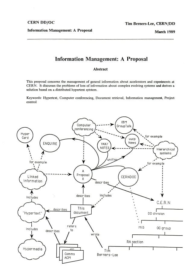 ในปี 1989 เบอร์เนอร์ส-ลี ได้เสนอโครงการ ‘World Wide Web’ เป็นครั้งแรก และได้ร่างเสนอโครงการครั้งที่ 2 ร่วมกับ โรเบิร์ต คายโย (Robert Cailliau) วิศวกรระบบชาวเบลเยียม ผ่านวิสัยทัศน์ที่นำโดยเบอร์เนอร์ส-ลี พวกเขาทั้งสองได้วางรากฐานสำคัญผ่านการนิยามศัพท์ที่พลิกโฉมการสื่อสารอย่าง Hypertext และ ‘Browser’
