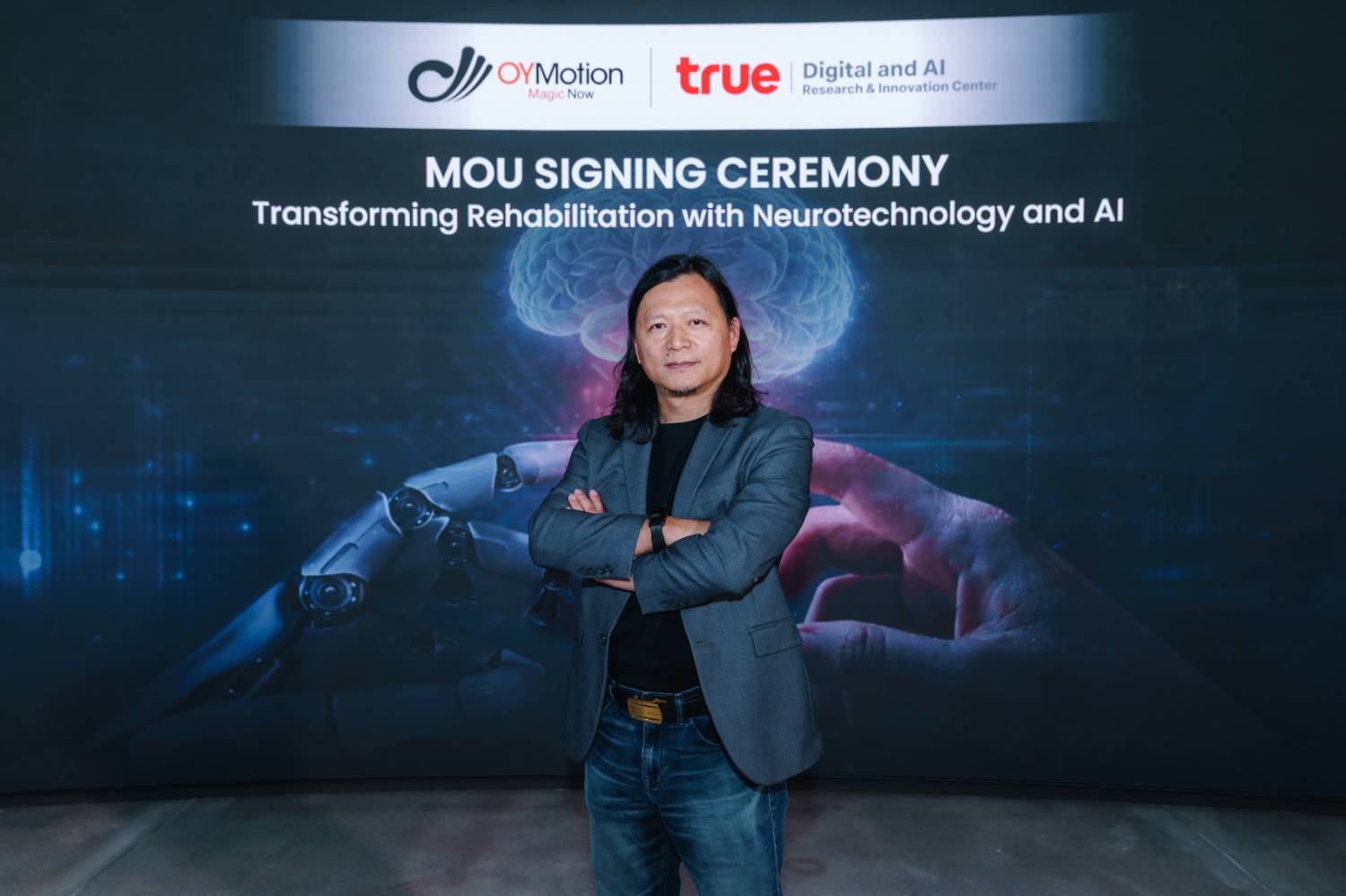 คุณเอกราช ปัญจวีณิน หัวหน้าศูนย์วิจัยและนวัตกรรม บมจ. ทรู คอร์ปอเรชั่น กล่าวว่า “ความร่วมมือกับ OYMotion ในครั้งนี้ สะท้อนความมุ่งมั่นของทรู คอร์ปอเรชั่น ผู้นำเทเลคอม-เทคคอมปานีไทย ในการสร้างสรรค์นวัตกรรมอย่างต่อเนื่องด้วยความเชื่อว่า เทคโนโลยีที่ทรงพลัง คือ เทคโนโลยีที่สามารถสร้างคุณค่าเชิงบวกและยกระดับคุณภาพชีวิตของผู้คนได้อย่างเป็นรูปธรรม ภายใต้ความร่วมมือครั้งนี้ ศูนย์วิจัยและนวัตกรรม ทรู คอร์ปอเรชั่น ได้สร้างระบบนิเวศนวัตกรรมที่จะบูรณาการความเชี่ยวชาญของสถาบันการแพทย์และบุคลากรทางการแพทย์ชั้นนำของไทย เข้ากับ ความเชี่ยวชาญของ OYMotion เทคโนโลยี Neuro AI และโครงสร้างพื้นฐานดิจิทัล เพื่อให้ผู้ป่วยได้รับโอกาสในการฟื้นฟูสมรรถภาพร่างกายที่มีคุณภาพและแม่นยำที่สุด การผสานความเชี่ยวชาญเฉพาะทางของแพทย์ไทยเข้ากับเทคโนโลยี NeuroTech ระดับโลก จะเป็นหัวใจสำคัญที่ผลักดันให้ระบบสาธารณสุขด้านการกายภาพบำบัดและการฟื้นฟูสมรรถภาพร่างกายของไทยก้าวล้ำสู่การเป็นศูนย์กลางด้าน NeuroTech ที่แข็งแกร่ง”