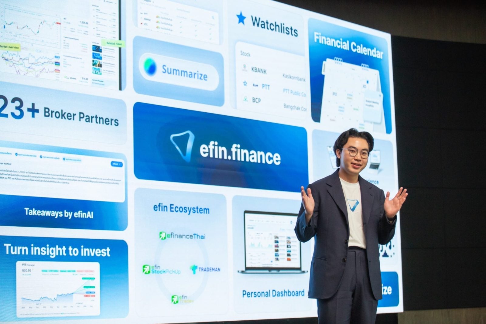 คุณพรเลิศ เตชะรัตโนภาส ประธานเจ้าหน้าที่บริหาร บริษัท ออนไลน์แอสเซ็ท จำกัด หรือ efin group และ คุณพสุธา ไดจิ อิเดะ Head of Business ระบุว่า แพลตฟอร์มนี้ถูกสร้างขึ้นเพื่อช่วยให้นักลงทุนทุกคน ตั้งแต่มือใหม่ไปจนถึงมืออาชีพ สามารถติดตามข้อมูล วิเคราะห์ และเข้าใจภาพรวมของตลาดได้สะดวก และรวดเร็วยิ่งขึ้น โดยนับเป็นหนึ่งในบริษัทฟินเทค (Fintech) ของไทยที่นำ AI มาใช้งานกับข้อมูลการลงทุนอย่างเต็มรูปแบบ