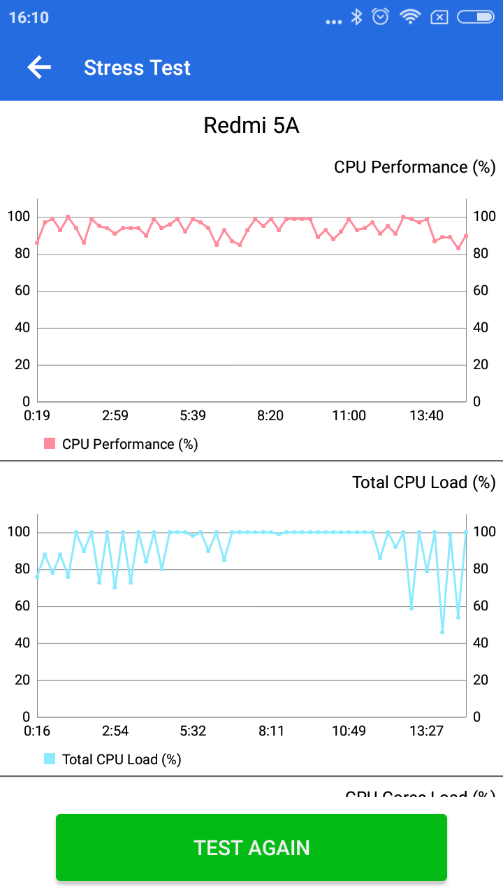 จากการทดสอบโดยใช้แอป Antutu ซึ่งเป็นแอปเทสความเร็วมือถือที่เราคุ้นเคยกันดีก็บอกได้เลยว่า คะแนนออกมาไม่ขี้เหร่ สูงถึง 43,770 เลยทีเดียว ส่วนการทดสอบ Stress Test 15 นาที CPU Performance มีความเสถียรสูง วิ่งอยู่ในช่วง 80 – 100% ไม่มีตก