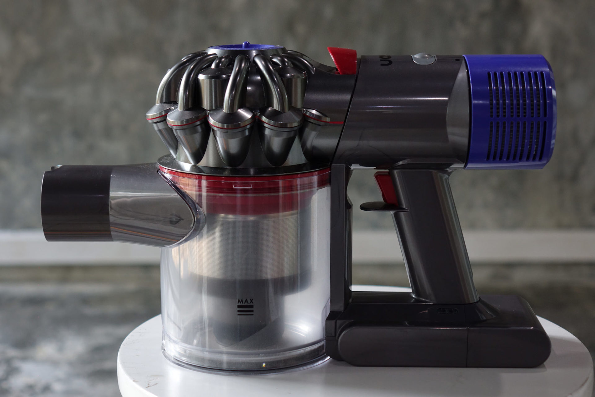 แน่นอนว่าเครื่องดูดฝุ่นจาก Dyson ก็ต้องใช้เทคโนโลยีไซโคลน โดย Dyson V8 มีท่ออากาศ 15 ชุด จัดเรียงสองชั้น ทำงานคู่ขนานกันช่วยเพิ่มกระแสลมซึ่งใช้แรงเหวี่ยงหมุนเร็วมากๆ จนเหมือนพายุไซโคลน เพื่อแยกฝุ่นให้แยกออกจากอากาศก่อนปล่อยเข้าไปในกล่องเก็บฝุ่น ฝุ่นจึงไม่ไปอุดที่ไส้กรอง ทำให้กำลังดูดไม่ลดลงแม้ฝุ่นจะเต็มกล่อง และไม่ต้องทำความสะอาดฟิลเตอร์กรองกันบ่อยๆครับ ตัวเครื่องผนึกอย่างแน่นหนาป้องกันการเล็ดลอดของฝุ่นละอองก่อนผ่านตัวกรอง ซึ่งก็สร้างความมั่นใจด้วย HEPA Filter ในขั้นตอนสุดท้ายเพื่อกรองฝุ่นละเอียด ออกไป ดักจับได้แม้กระทั่งสารก่อภูมิแพ้