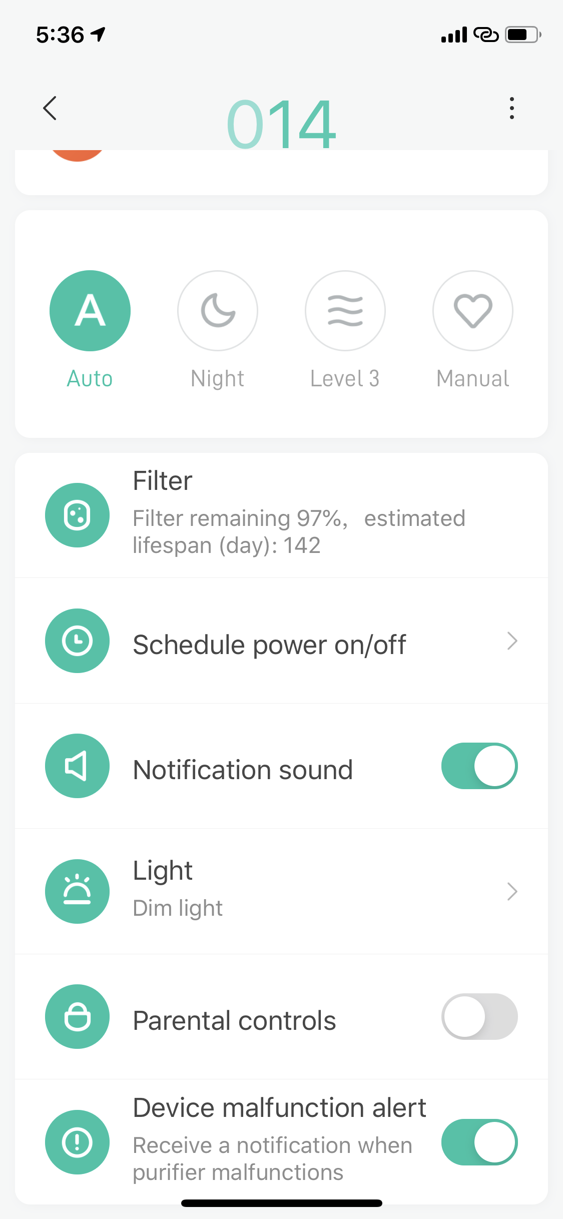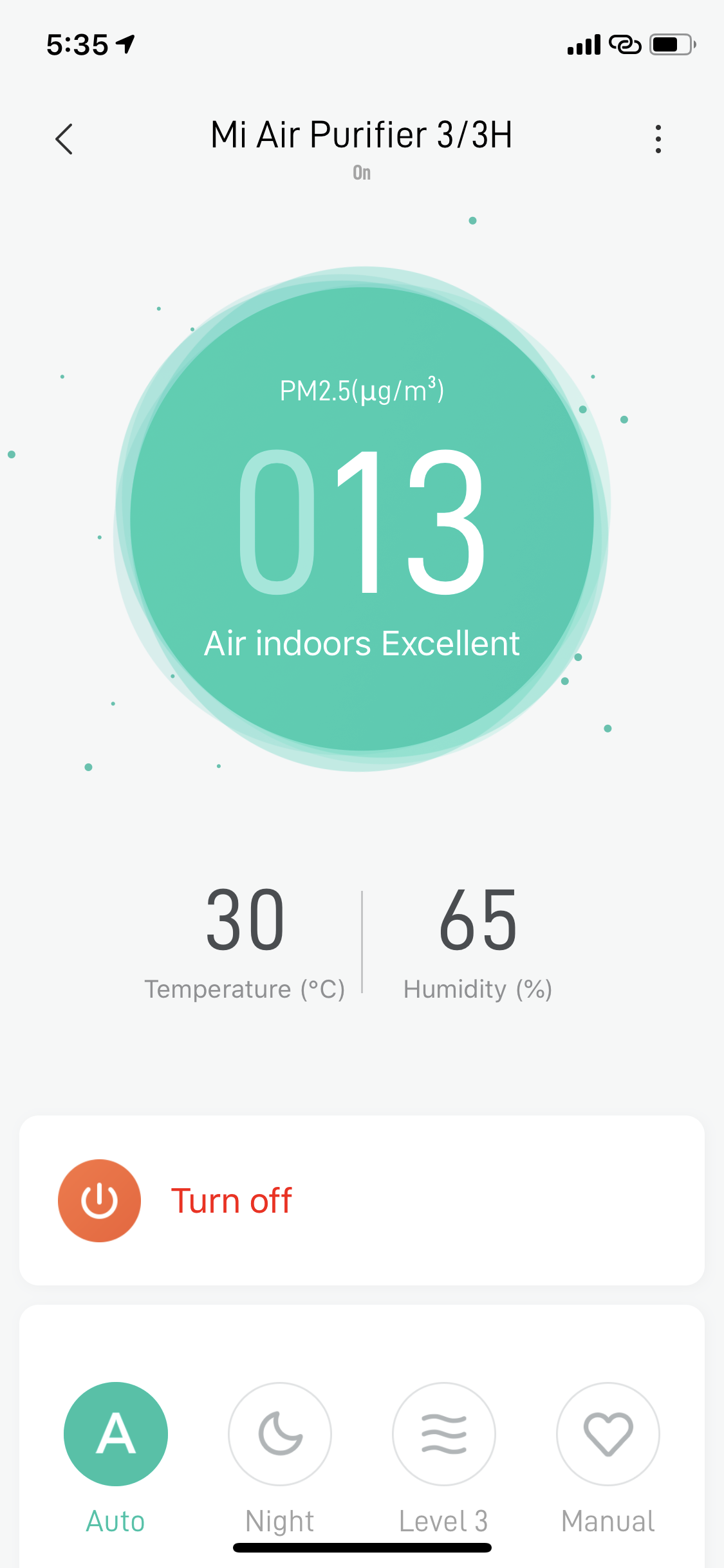 เมื่อเชื่อมต่อเสร็จแล้วจะเข้าสู่หน้าจอหลักของ Xiaomi Air Purifier 3H โดยตัวแอปจะแสดงค่า PM 2.5 และโหมดการใช้งานอื่น ๆ ตามภาพด้านล่างนี้