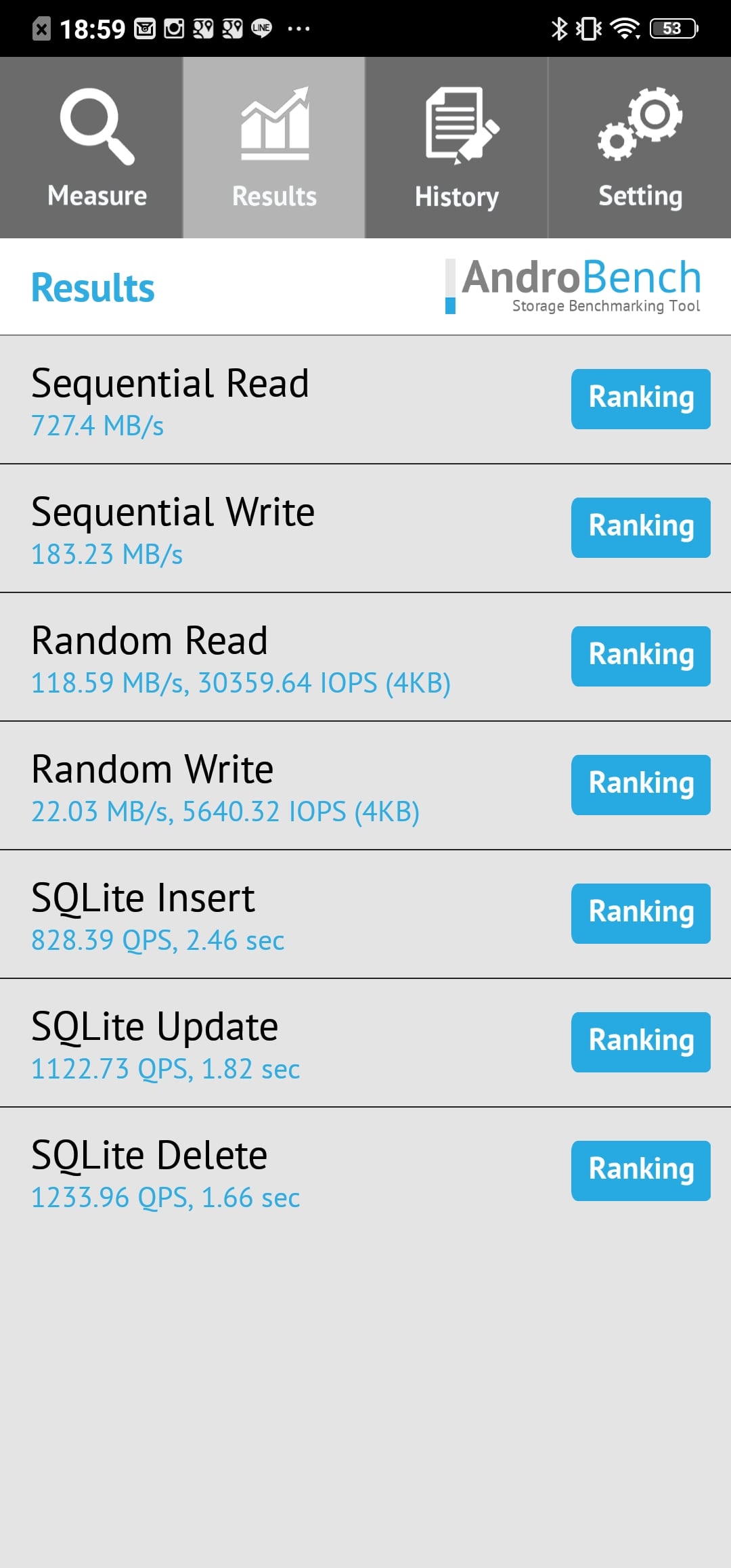 - และทดสอบความเร็วในการอ่านข้อมูลของหน่วยความจำในเครื่องด้วย AndroBench ได้ความเร็วอ่านต่อเนื่องไปราว 730 MB/s อันนี้ถือว่ากลางๆ