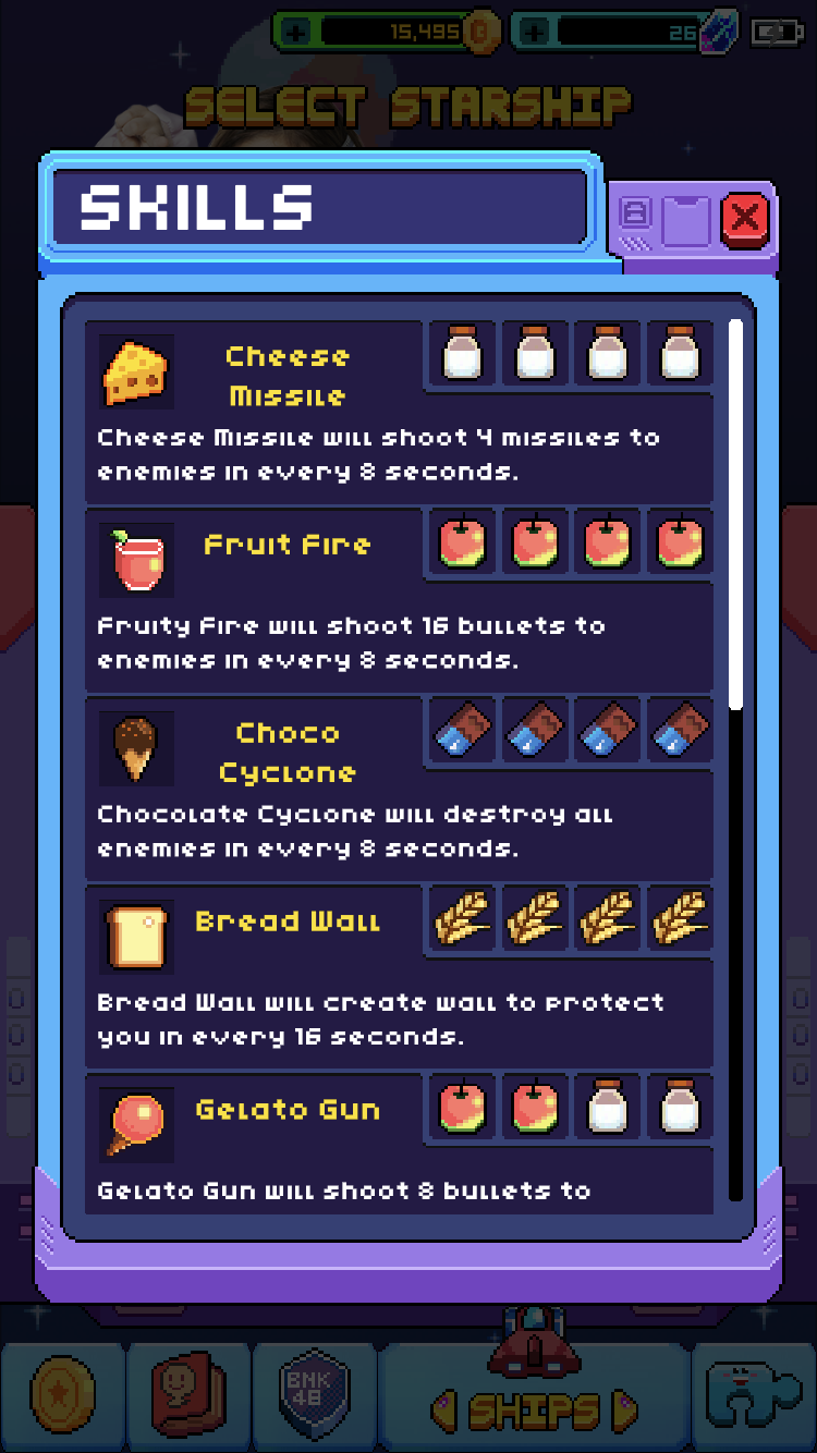 - Pie Protect (รูปแอปเปิ้ล 2 ใบ รูปต้นข้าว 2 ใบ) สร้าง 6 ตัวป้องกันรอบยานของเราเพื่อป้องกันศัตรูทุก 8 วินาที