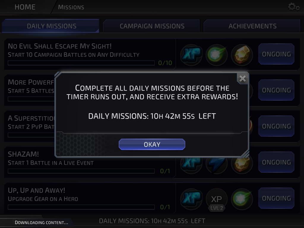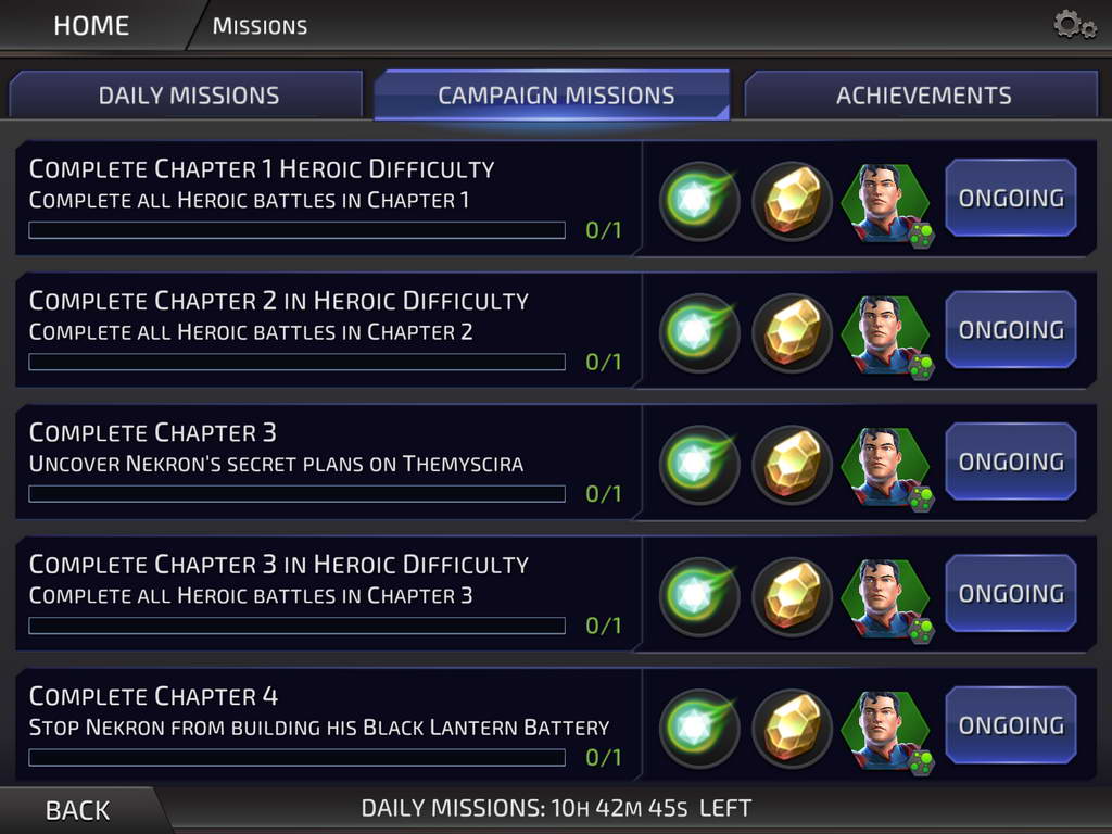 - Missions เราสามารถทำภารกิจของเกมได้โดยมีทั้งแบบภารกิจประจำวัน ภารกิจของ Campaign โดยจะได้ไอเทมไว้อัพเกรดตัวละครได้