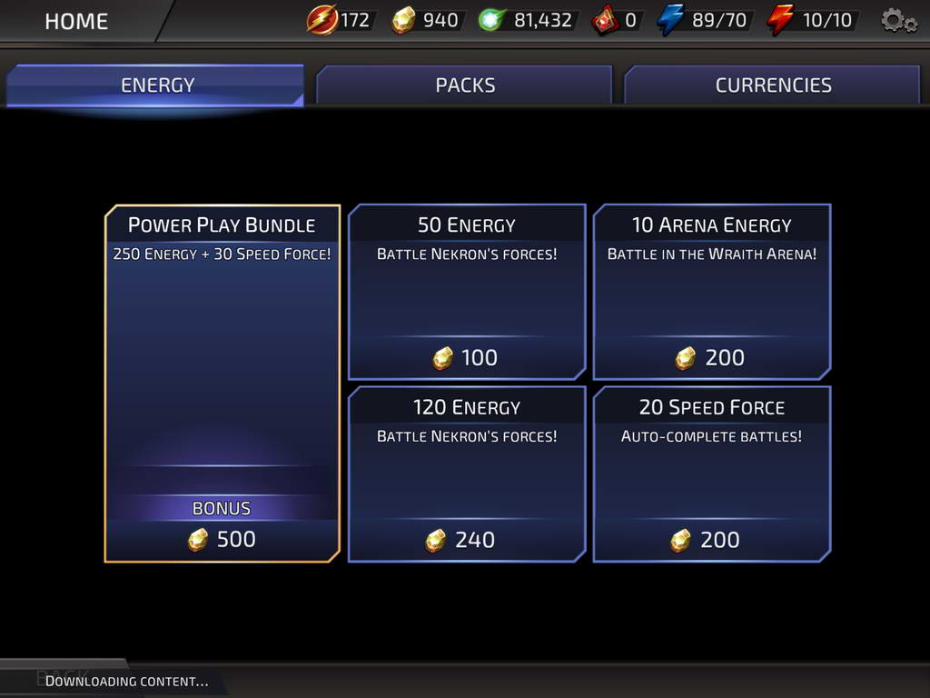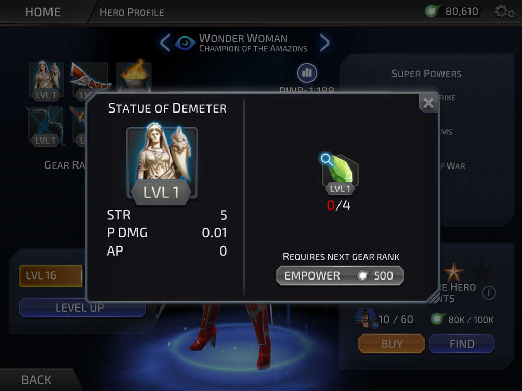- Gems ส่วนนี้เราสามารถใช้เงินจริงซื้อ หรือจากของรางวัลประจำวัน หรือจากการเล่นใน Story Campaign ก็ได้ สามารถใช้ซื้อตัวละครในเกมได้ ซึ่งมีหลายรูปแบบ เช่น 10 Luthors Leaping (10 ชิ้นส่วนตัวละครของ Lex Luthor) หรือ Mini Pack หรือ Hero Pack ซึ่งแต่ละแบบก็จะได้ไอเทม หรือชิ้นส่วนตัวละครที่ไม่เหมือนกัน