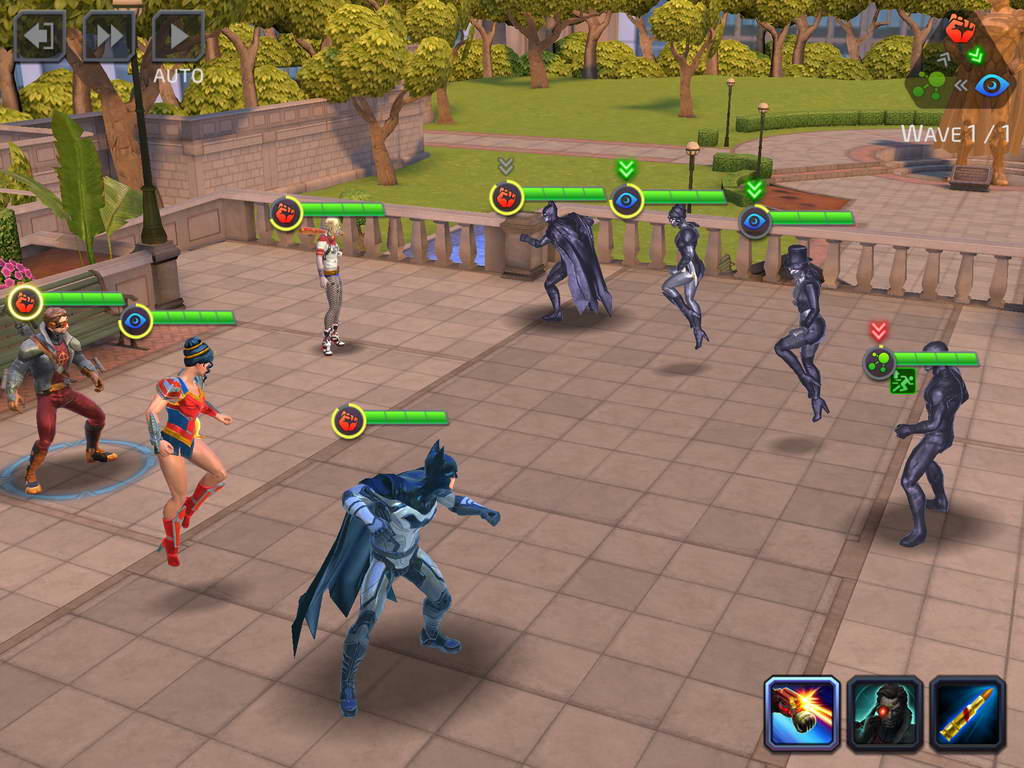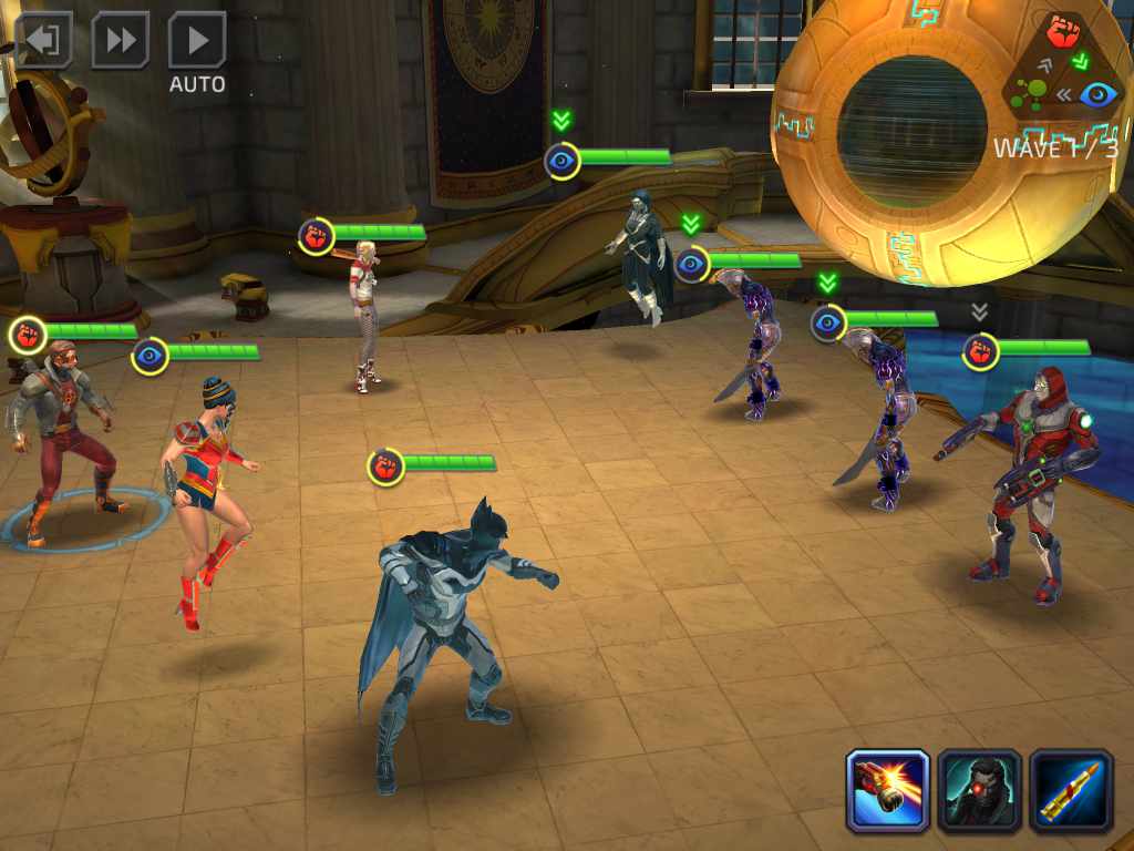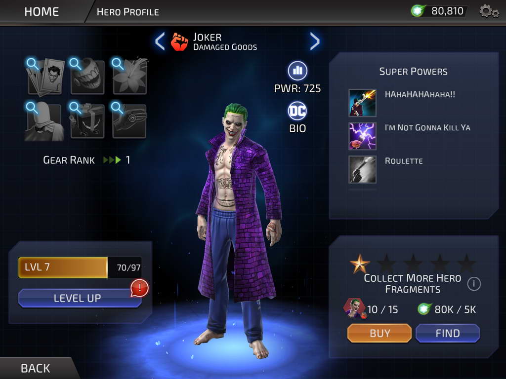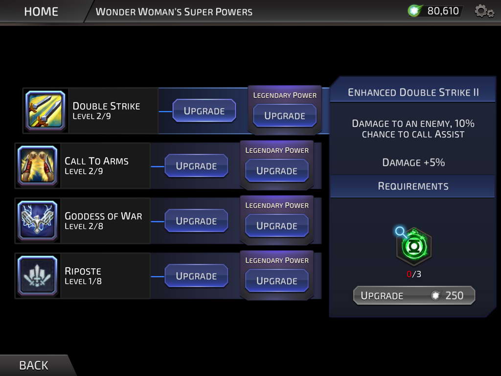 ซึ่งแต่ละตัวละครก็มีอยู่หลายชุด เช่น Wonder Woman มีทั้ง Champion of the Amazons หรือ Princess of Themyscira ซึ่งความสามารถก็จะมีแตกต่างกันไป