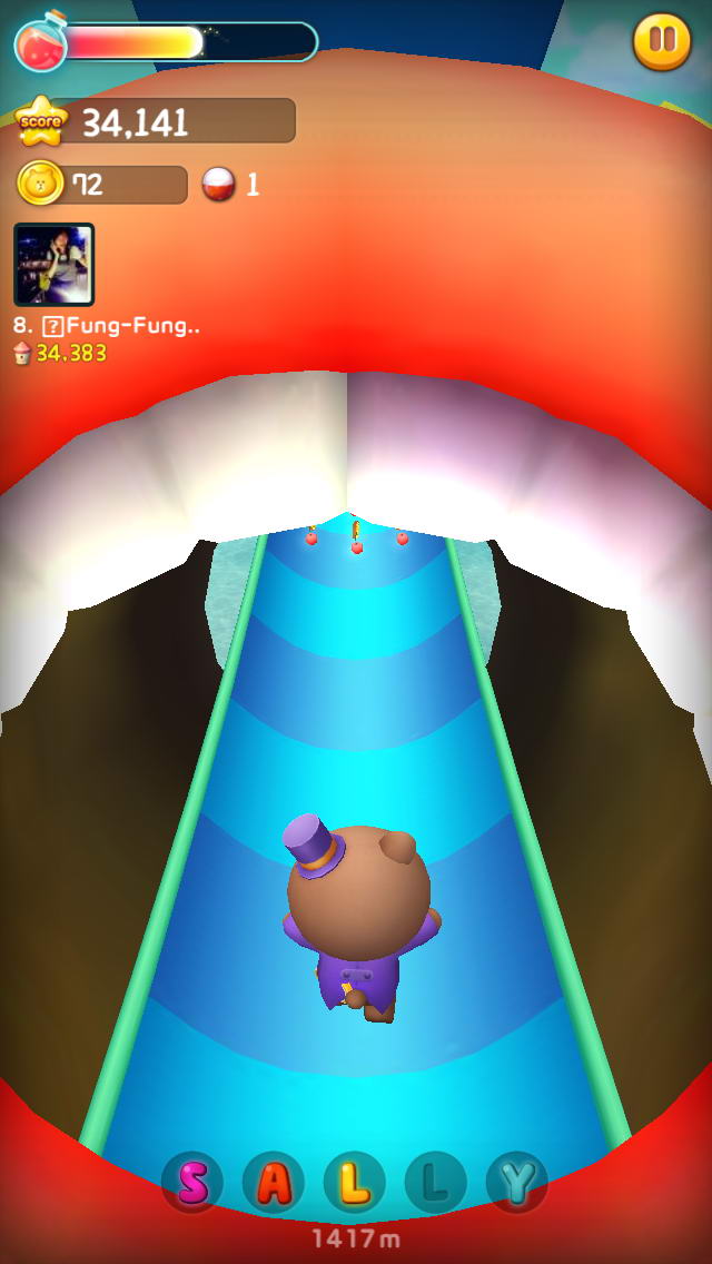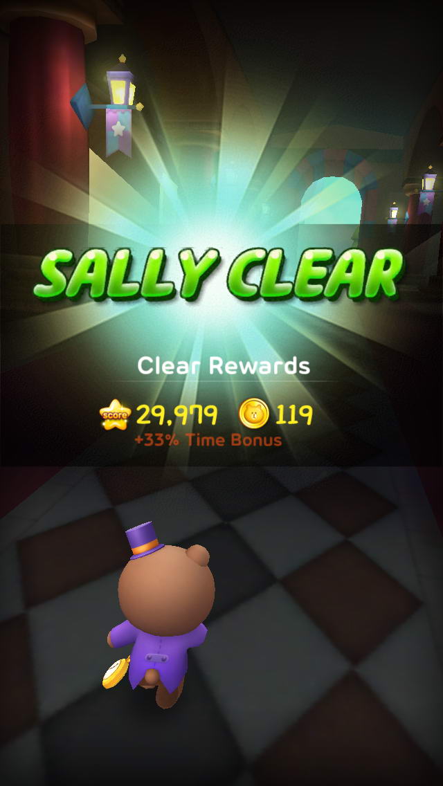 เมื่อเริ่มเล่นครั้งแรก จะมีตัวละครให้เล่น 1 ตัว ก่อนเริ่มก็จะมีไอเท็มปืนใหญ่ จรวด ยาเพิ่มเลือดพิเศษ หรือตัวเพิ่มเวลา จากนั้นก็ให้เราวิ่ง วิ่ง แล้วก็วิ่งไปข้างหน้า โดยให้เร็วสไลด์ไปทางซ้ายหรือขวา สไลด์ลงหรือกระโดดตามฉากไป ซึ่งมีทั้งทางปกติ ทางแยกซ้ายหรือขวา หรือเป็นทางลาดลงที่ต้องเลื่อนซ้ายขวา ในฉากจะมีไอเท็มให้เก็บ ทั้งเหรียญ เชอร์รี่ บลูเบอร์รี่ แม่เหล็ก คัพเค้กเพิ่มพลังให้ไอเท็ม รองเท้าวิ่งเร็ว ยาเพิ่มเลือด หรือยาขยายร่าง และยังมีตัวอักษรชื่อตัวละครของ LINE อย่าง Sally โดยให้เก็บ S A L L Y เมื่อเก็บครบจะต้องทำการต่อสู้ ด้วยการเก็บจรวด เพื่อให้จรวดไปชน Sally ถ้าชนะจะได้คะแนนพิเศษตามไอเท็มที่เก็บได้ ซึ่งจะมีมากกว่าฉากปกติด้วย ยังมีตัวปีศาจให้เราสไลด์ชนหรือกระโดดจัดการด้วย เมื่อหลอดเลือดหมดก็จบเกม