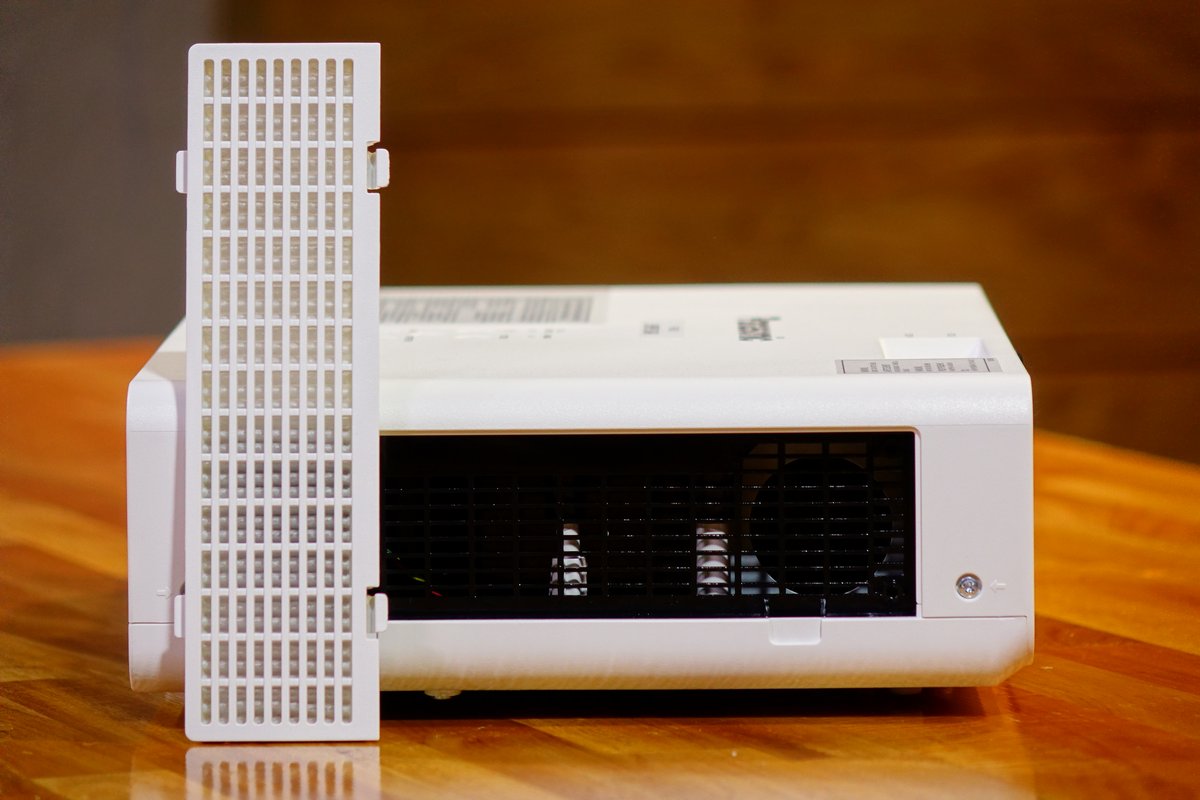 ทางด้านขวาของตัวเครื่องเป็นช่องดูดอากาศเข้าที่ผู้ใช้สามารถถอดเปลี่ยนฟิลเตอร์ได้เมื่อถึงเวลา ส่วนทางด้านซ้ายของเครื่องก็เป็นช่องอากาศออกครับ ลมร้อนก็จะออกมาทางนี้แหละ สุดท้ายคือด้านบนเครื่องที่มีปุ่มควบคุมง่ายๆ อยู่ 6 ปุ่ม เอาไว้เปิด-ปิด เลือกแหล่งภาพ เปิดเมนู และสามารถหมุนวงแหวนเพื่อโฟกัสภาพและปรับการซูมของโปรเจกเตอร์ได้จากด้านบนนี้