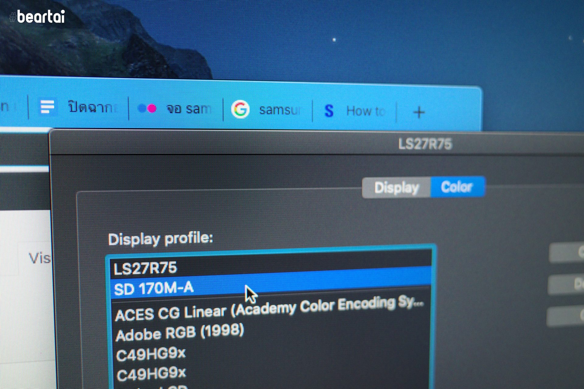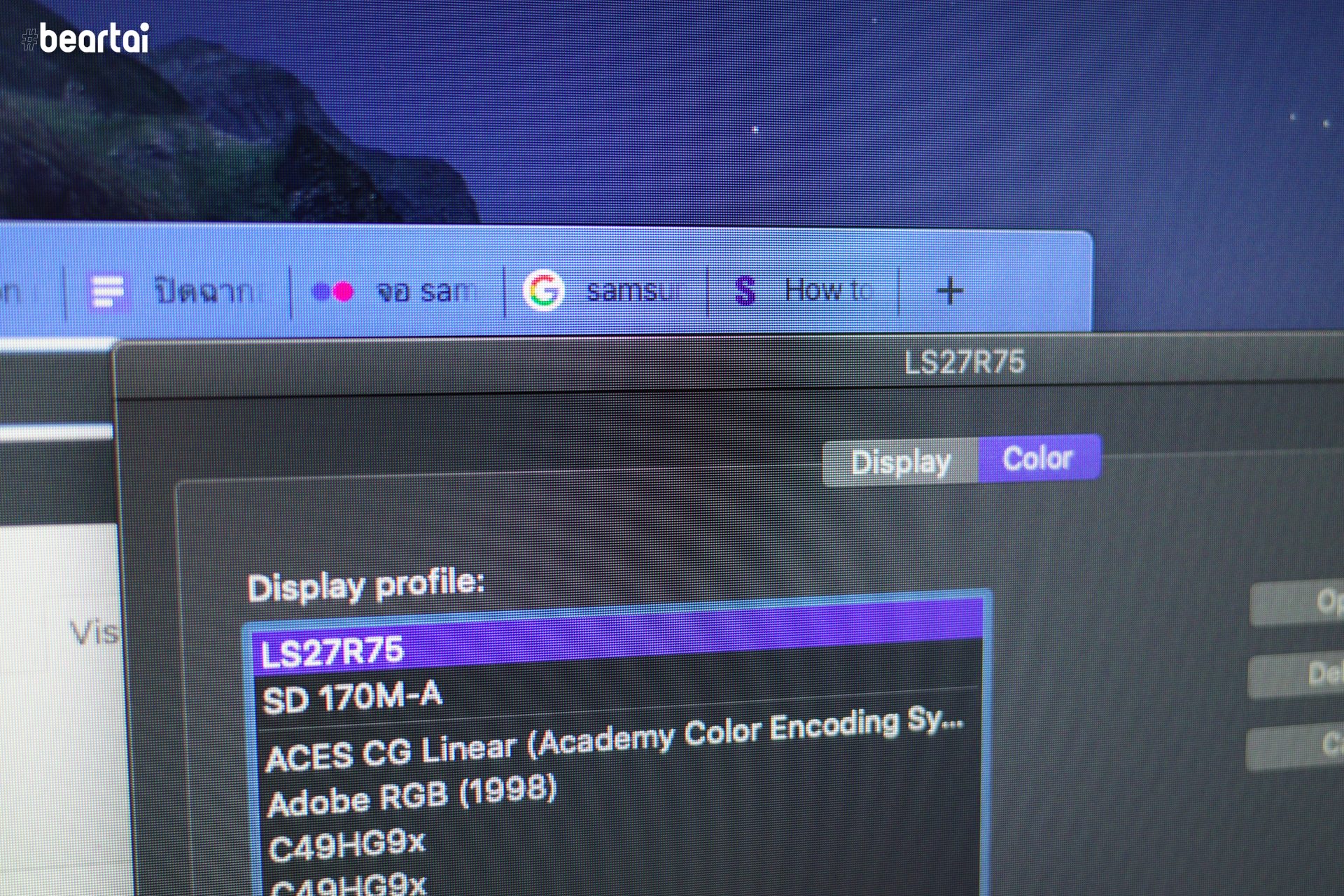 จุดเด่นของแผงหนัาจอชนิด VA ที่ใช้ใน Samsung Space Monitor คือให้ Contrast ได้สูงสุด 3000:1 ซึ่งสูงกว่าจอแบบ IPS ทั่วไป จึงทำให้ภาพที่แสดงออกมาดูดี แต่ก็มีข้อเสียคือจอชนิด VA จะให้มุมมองภาพที่แคบกว่าจอชนิด IPS ครับ ทำให้จอรุ่นนี้เหมาะสำหรับการใช้งานตรงๆ เป็นหลัก ถ้ามองจากมุมเอียงซ้ายหรือขวาจะรู้สึกว่าจอมืดลง และสีสันจืดลง นอกจากนี้ยังไม่รองรับการแสดงผลแบบ HDR ในรูปแบบใดๆ เลย และระหว่างที่เราทดสอบการใช้งานจอรุ่นนี้กับ MacBook ที่ใช้ macOS Catalina ก็พบว่าโปรไฟล์สีมาตรฐานของจอที่เครื่องแมคนำมาใช้คือ LS27R75 แสดงสีเพี้ยนจากความจริง คือแสดงสีน้ำเงินกลายเป็นสีม่วง ก็ต้องเปิดหน้า Settings ของแมคขึ้นมาแล้วเปลี่ยน Display Profile เป็นแบบมาตรฐานเช่น SD 170M-A หรือ Color LCD แทนครับ ใครที่ใช้จอนี้ก็ลองดูเรื่อง Color Profile ด้วยนะครับ