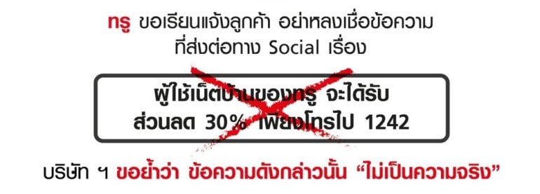 true ชี้แจงข่าวส่วนลด 30% ที่แพร่กระจายตาม Social เป็นข่าวปลอม อย่าหลงเชื่อแชร์ต่อ