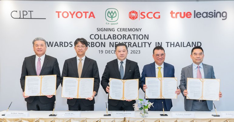 เครือเจริญโภคภัณฑ์ (ซีพี) ทรู ลีสซิ่ง ปูนซิเมนต์ไทย (เอสซีจี) โตโยต้า มอเตอร์ คอร์ปอเรชั่น (โตโยต้า) และ Commercial Japan Partnership Technologies Corporation (CJPT) ร่วมลงนามในบันทึกความเข้าใจ (MOU) เพื่อเร่งความร่วมมือในการมุ่งสู่การบรรลุความเป็นกลางทางคาร์บอนในประเทศไทย โดย MOU นี้เกิดขึ้นจากความสำเร็จในปัจจุบัน ซึ่งเป็นผลจากความพยายามร่วมกันของทุกฝ่าย รวมถึงประสิทธิภาพด้านการขนส่งของซีพี และเอสซีจี และการใช้ยานยนต์จากพลังงานที่หลากหลายตามความต้องการในประเทศไทย ความร่วมมือนี้เกิดขึ้นจากความสัมพันธ์ที่ดีและความเชื่อมั่นระหว่างนายธนินท์ เจียรวนนท์ ประธานอาวุโส เครือเจริญโภคภัณฑ์ นายรุ่งโรจน์ รังสิโยภาส กรรมการผู้จัดการใหญ่ บริษัทปูนซิเมนต์ไทย จำกัด (มหาชน) หรือ เอสซีจี และนายอากิโอะ โตโยดะ ประธาน บริษัท โตโยต้า (ในขณะนั้น) ซีพี ทรู ลีสซิ่ง เอสซีจี โตโยต้า และ CJPT ได้เริ่มต้นดำเนินการใน 3 ด้าน ได้แก่…กองบรรณาธิการ BT | 756 days ago