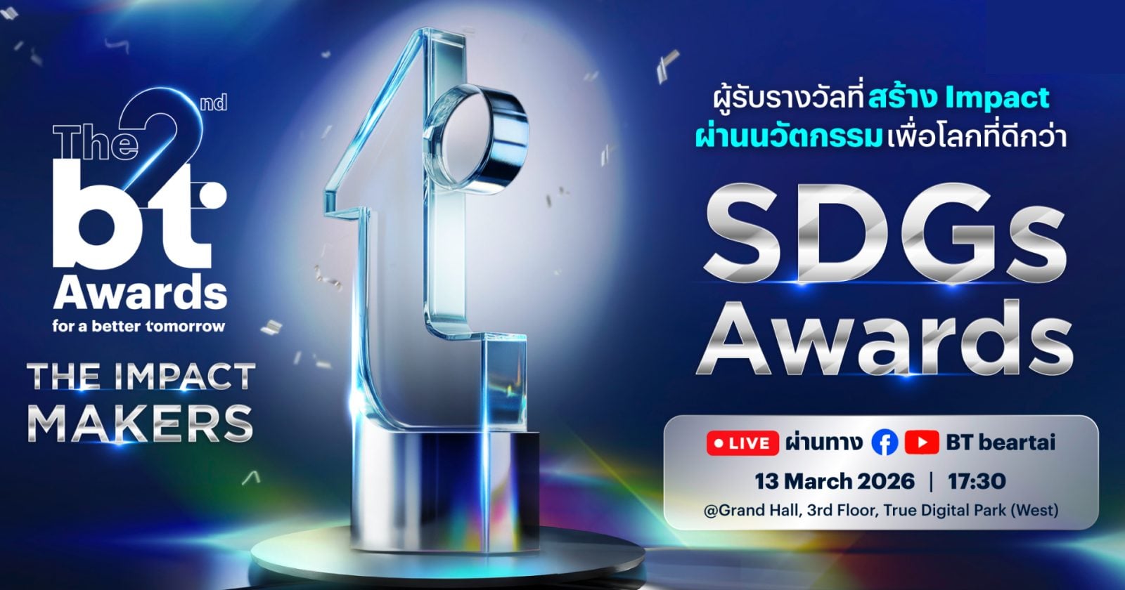 BT ขอประกาศผู้ที่ได้รับรางวัล SDGs Awards ใน The 2nd BT Awards: The Impact Makers รางวัลที่มอบให้กับผู้ที่สร้างผลกระทบเชิงบวกให้กับโลกเพื่อวันพรุ่งนี้ที่ดีกว่า ผ่านเป้าหมายพัฒนาที่ยั่งยืน หรือ SDGs (Sustainable Development Goals) ที่ครอบคลุมในทุกมิติ ตั้งแต่สิ่งแวดล้อม สังคม ความเท่าเทียม การศึกษา นวัตกรรม ความยากจน สุขภาพ พลังงานสะอาด เศรษฐกิจดิจิทัล และอีกอื่น06/03/2026