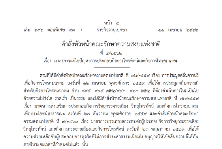 คณะคสช. ประกาศใช้มาตรา 44 ช่วยเหลือผู้ประกอบการทีวีดิจิทัล เปิดช่องให้สามารถคืนใบอนุญาตประกอบการได้ ไม่ต้องจ่ายเงินค่าประมูลที่เหลือ พร้อมทั้งยืดระยะเวลาในการชำระค่าใบอนุญาตคลื่นความถี่ 900 เมกกะเฮิร์ตซ์ ให้กับค่ายมือถือ จากเดิม 4 ปี เป็น 10 ปี เว็บไซต์ราชกิจจานุเบกษาได้ออกประกาศคำสั่งของคณะรักษาความสงบแห่งชาติ หรือ คสช. ฉบับที่ 4/2562 ว่าด้วยเรื่องของมาตรการแก้ไขปัญหาให้กับผู้ประกอบการทีวีดิจิทัล และผู้ประกอบการกิจการโทรคมนาคม โดยในคำสั่งดังกล่าวได้ระบุเป็นสองส่วน ดังนี้ กรณีผู้ประกอบกิจการโทรคมนาคม การช่วยเหลือครั้งนี้ อ้างอิงไปถึงการประมูลคลื่นความถี่ 900 เมกกะเฮิร์ตซ์ ช่วงย่านความถี่ 895 -915 และ 940 - 960 และในย่าน 890 - 895 และ 935 - 940 โดยผู้ที่ได้ใบอนุญาตในคลื่นความถี่ชุดดังกล่าวนั้น ทางสำนักงานกสทช. จะทำการพิจารณาการแบ่งงวดชำระค่าใบอนุญาต โดยที่ชำระออกเป็นสิบงวด งวดละเท่าๆ กัน (จากเดิมที่ต้องชำระเป็นสี่งวด งวดละเท่าๆ กัน) โดยให้นับปีที่ได้รับใบอนุญาตเป็นปีแรกของการชำระค่างวด…ธีระภัทร โตสวัสดิ์ | 2468 days ago