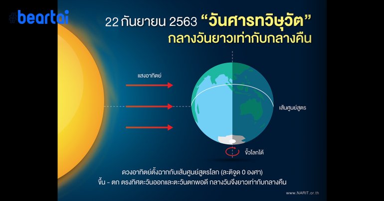 วนมาอีกครั้งกับวันแห่งการเปลี่ยนผ่านฤดู 'ศารทวิษุวัต' กลางวันยาวเท่ากลางคืน 22 กันยายนนี้ หากอยากพิสูจน์ให้ลองสังเกตทิศที่ดวงอาทิตย์ขึ้นตกดู นายศุภฤกษ์ คฤหานนท์ หัวหน้างานบริการวิชาการทางดาราศาสตร์ สถาบันวิจัยดาราศาสตร์แห่งชาติ (องค์การมหาชน) (NARIT) กล่าวว่า วันที่ 22 กันยายนนี้ เป็นวัน “ศารทวิษุวัต” (สาด-ทะ-วิ-สุ-วัด) (Autumnal Equinox) เวลากลางวันและกลางคืนยาวเท่ากัน สำหรับประเทศไทย วันดังกล่าวดวงอาทิตย์ขึ้นเวลาประมาณ 06:07 น. และจะตกลับขอบฟ้า เวลาประมาณ 18:14 น. นับเป็นวันเริ่มต้นฤดูใบไม้ร่วงของประเทศทางซีกโลกเหนือ และเข้าสู่ฤดูใบไม้ผลิของประเทศในซีกโลกใต้ คำว่า “Equinox” มีรากศัพท์มาจากภาษาละติน 2 คำ คือ Aequus แปลว่า เท่ากัน และ Nox แปลว่า กลางคืน ดังนั้น Equinox หมายถึงวันที่กลางวันและกลางคืนยาวเท่ากัน ตรงกับคำว่า “วิษุวัต” แปลว่า "จุดราตรีเสมอภาค" โดยวันที่กลางวันและกลางคืนยาวเท่ากันนี้จะเกิดขึ้นเพียง 2 ครั้งต่อปี คือในช่วงเริ่มต้นของฤดูใบไม้ผลิ เรียกว่า วันวสันตวิษุวัต (Vernal Equinox) และในช่วงเริ่มต้นฤดูใบไม้ร่วง เรียกว่า วันศารทวิษุวัต (Autumnal Equinox) ในแต่ละวันดวงอาทิตย์จะปรากฏอยู่ตำแหน่งที่ต่างกัน เปลี่ยนตำแหน่งไปประมาณวันละ 1 องศา ตั้งแต่เดือนมิถุนายน ดวงอาทิตย์ค่อย ๆ เคลื่อนที่จากจุดเหนือสุดลงมาทางใต้ เมื่อดวงอาทิตย์เคลื่อนมา ณ ตำแหน่งตั้งฉากกับเส้นศูนย์สูตรของโลก ทำให้ 'ดวงอาทิตย์ขึ้นจากขอบฟ้าทางทิศตะวันออกและตกทางทิศตะวันตกพอดี' ดังนั้น หากเรายืนอยู่ในจุดเดิมทุกวัน เราก็จะเห็นตำแหน่งขึ้นตกของดวงอาทิตย์ต่างไป ความแตกต่างของตำแหน่งดวงอาทิตย์นี่เอง ที่นำไปสู่การออกแบบแผนผังหรือสิ่งปลูกสร้างบูชาสิ่งศักดิ์สิทธิ์ในอดีตหลายแห่ง ช่วยให้เราสังเกตปรากฏการณ์ดังกล่าวได้ชัดเจนขึ้น จากนั้นดวงอาทิตย์จะเคลื่อนลงทางใต้เรื่อย ๆ จนดวงอาทิตย์ขึ้นทางทิศตะวันออกเฉียงไปทางใต้มากที่สุด…วัฒนา ขจัดสารพัดภัย | 1938 days ago