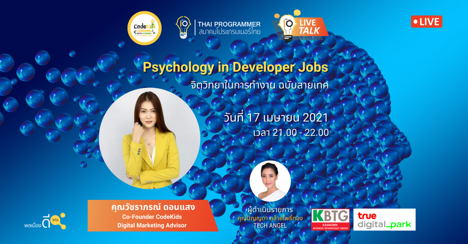 17/04/2021Psychology in Developer Jobs"จิตวิทยาในการทำงาน ฉบับสายเทค"LIVE เจาะลึกเทคนิค เคล็ดลับจิตวิทยา สำหรับนักพัฒนาและสายเทคโนโลยี ที่ไม่ควรพลาด จิตวิทยาในชีวิตประจำวัน สำคัญอย่างไร?จิตวิทยาที่ดี ควรเป็นอย่างไร?การมีจิตวิทยาที่ดี มีประโยชน์อะไรบ้าง?การนำจิตวิทยาไปปรับใช้ในการทำงานหรือการเข้าสังคม ฉบับนักพัฒนาและสายเทคโนโลยี ร่วมตอบคำถามโดย คุณวัชราภรณ์ ดอนแสงCo-Founder CodeKidsDigital Marketing Advisorสามารถติดตาม…