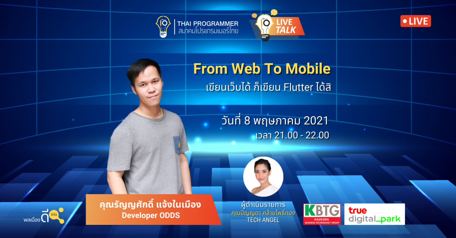 14/03/2021Next Step Coding With Flutter V.2"ก้าวต่อไปของการเขียนโค้ดด้วย Flutter V.2"เราเคยทำเสนอ Flutter Coding ไปแล้ว [คลิกชมของเก่าได้ที่นี่] แต่รอบนี้จะพาคุณไปเรียนรู้ลึกขึ้น ดำเนินรายการโดย “TECH ANGEL”คุณปัญญดา คล้ายโพธิ์ทองพิธีกรมากประสบการณ์แห่งวงการ Tech Startupร่วมตอบคำถามโดยคุณกฤษฎา วิเวกSoftware…