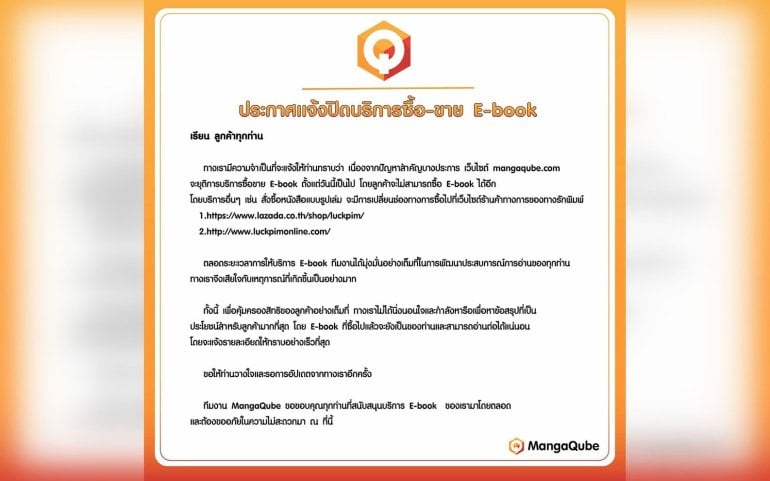 MangaQube ร้าน e-Book ของรักพิมพ์ ประกาศปิดบริการขายหนังสือ! เล่มที่เคยซื้อยังโหลดได้