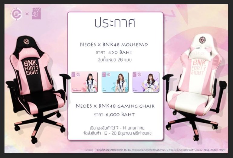 เหล่าโอตะสายเกมเมอร์ห้ามพลาด สินค้า Gaming จาก BNK48 ที่จับมือกับทาง Neolution E-Sport ผลิตสินค้าสำหรับเหล่าคนรัก BNK48 ให้คุณได้ซื้อไปฟิินกันถึงบ้าน เผยวันเปิดจองแล้ว 7 พ.ค. นี้ ! โดยสินค้า NeoES x BNK48 จะมีด้วยกัน 4 ชิ้นคือ เก้าอี้ NeoES x BNK48 ราคา 6,000 บาท(รวมค่าจัดส่ง) มีให้เลือก 2 สีคือ สีขาว กับสีดำ จำกัดสิทธิ์ให้ซื้อไม่เกิน 2 ตัว เปิดให้จองจำนวน 390 ตัวเท่านั้น แผ่นรองเมาส์รูปสมาชิกวง BNK48 ราคา 450 บาท มีทั้งหมด 26 แบบ จากสมาชิกวง BNK48 26 คน *โดยได้รับสินค้าสุ่ม 1 แผ่น…Totsapon Kritsadangphorn | 2811 days ago