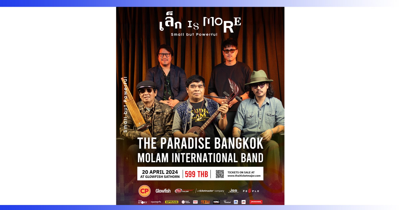 หลังจากเปิดม่าน เล็ก Is More ปรากฎการณ์คอนเสิร์ตซีรีส์แห่งปีจาก The People ที่ชวนคนฟังมาสัมผัสอีกเฉดสีของการสร้างสรรค์งานดนตรีจากเหล่าศิลปินรุ่นใหม่กันไปแล้วเมื่อกลางเดือนมีนาคมที่ผ่านมา วันนี้ถึงคิวของสวรรค์บางกอก หมอลำอินเตอร์ ผู้เสกความมหัศจรรย์ให้ท่วงทำนองอีสานกระหึ่มโลกมาแล้ว กับ ‘เล็ก Is More’ #2 ตอน ‘เซิ้ง on the Floor’ Featuring ‘The Paradise Bangkok Molam International Band’ The Paradise Bangkok Molam International Band เป็นการรวมตัวกันของ คำเม้า เปิดถนน มือพิณ ที่ได้รับฉายาว่า ‘Jimi Hendrix of the Phin’ ไสว แก้วสมบัติ หมอแคนผู้มีสำเนียงเพลงอันเป็นเอกลักษณ์ ปั๊ม-ปิย์นาท กรัดศิริ โชติกเสถียร มือเบสประจำวงอพาร์ทเมนต์คุณป้า ภูษณะ ตรีบุรุษ มือกลอง และณัฐพล…12/03/2024