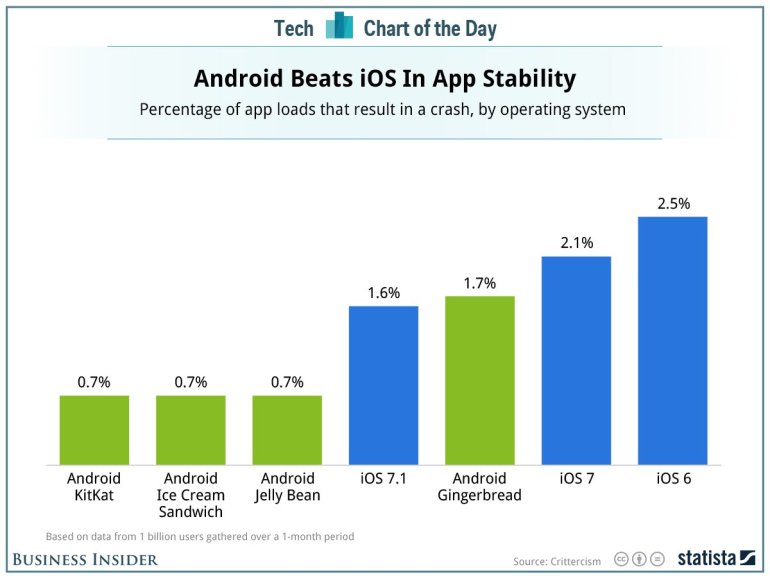 มีผลการศึกษาวิจัยจาก Crittercism บริษัทศึกษาและจัดการประสิทธิภาพแอพพลิเคชั่นบนอุปกรณ์พกพา ซึ่งได้ออกมาเปิดเผยกราฟฟิกแสดงอัตราความผิดพลาดในการทำงานของแอพพลิเคชันบนระบบ iOS เมื่อเปรียบเทียบกับระบบปฏิบัติการ Android ซึ่งสร้างความแปลกใจเมื่อชาร์จดังกล่าวระบุว่า แอพพลิเคชันบนระบบ iOS มีสถิติการเกิดความผิดพลาดมากกว่าระบบ Androidณัฐพันธ์ ส่งวิรุฬห์ | 4305 days ago