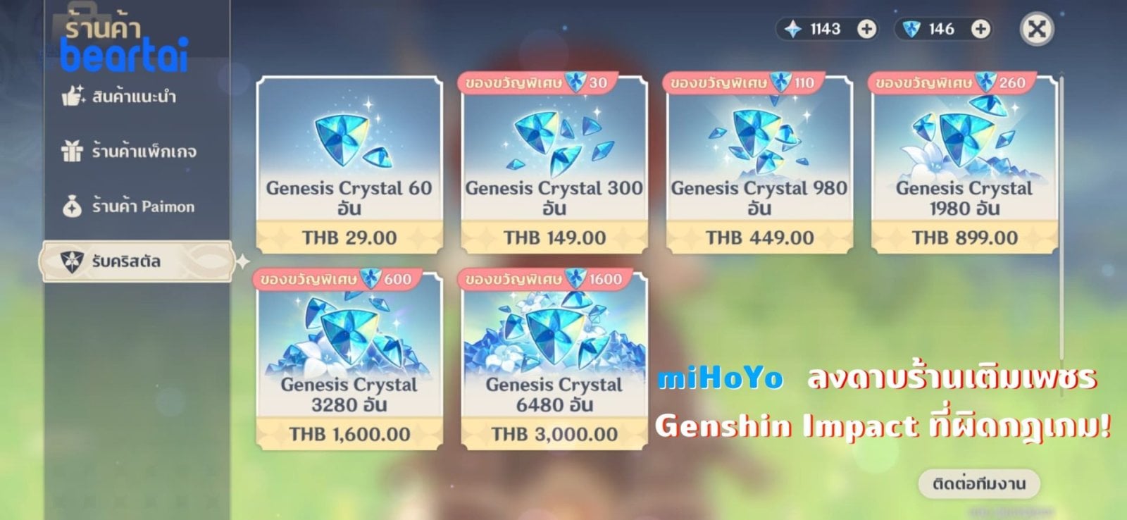 Genshin Impact ปัจจุบันเป็นเกมที่กำลังมีกระแสมาแรงมาก ๆ ถึงแม้จะเป็นเกมที่เพิ่งเปิดมาได้เพียง 2 เดือน แต่สามารถทำรายได้ไปได้ติดอันดับ 1 ถึง 2 เดือนติด ด้วยมูลค่ารวมกว่า 11,800 ล้านบาทจากรายงานของ Sensor Tower ซึ่งเป็นรองเพียงเกม Honor of Kings เท่านั้น และหลาย ๆ คนก็น่าจะเคยเห็นโฆษณารับเติมเงินเกมนี้กันอยู่บ้างไม่มากก็น้อย ซึ่งแต่ละร้านก็จะมีการแนะนำว่า สามารถเติมเงินได้ในราคาถูกกว่าเดิม 20 - 30% เลยทีเดียว ทำให้หลาย ๆ คนที่อยากเติมเกมถูก มองหาร้านค้าเหล่านี้ในการเติมเงิน แต่อย่างไรก็ตามการเติมเงินโดยบุคคลภายนอกของเกมนี้ มีความเสี่ยงอยู่แล้วเป็นทุนเดิม เพราะคนที่เติมจะต้องส่ง User และ Password ให้กับบุคคลภายนอก และยังเสี่ยงทำให้มีโอกาสโดนขโมยข้อมูลได้อีกด้วย รวมไปถึงความเสี่ยงในการที่ร้านค้าเถื่อนที่เติมเงินให้เราแล้ว ทำการกด Refund เงินคืน ซึ่งจะทำให้ Gem ที่เราเติมไปนั้นถูกดึงคืนจนติดลบ ซึ่งใครที่อยากเล่นต่อก็ต้องเติมเงินคืนจนกว่า Primogem ที่แสดงผลจะกลายเป็นบวก ซึ่งเรียกได้ว่าเจ็บแสบเลยล่ะ แน่นอนว่าทาง…Totsapon Kritsadangphorn | 1928 days ago