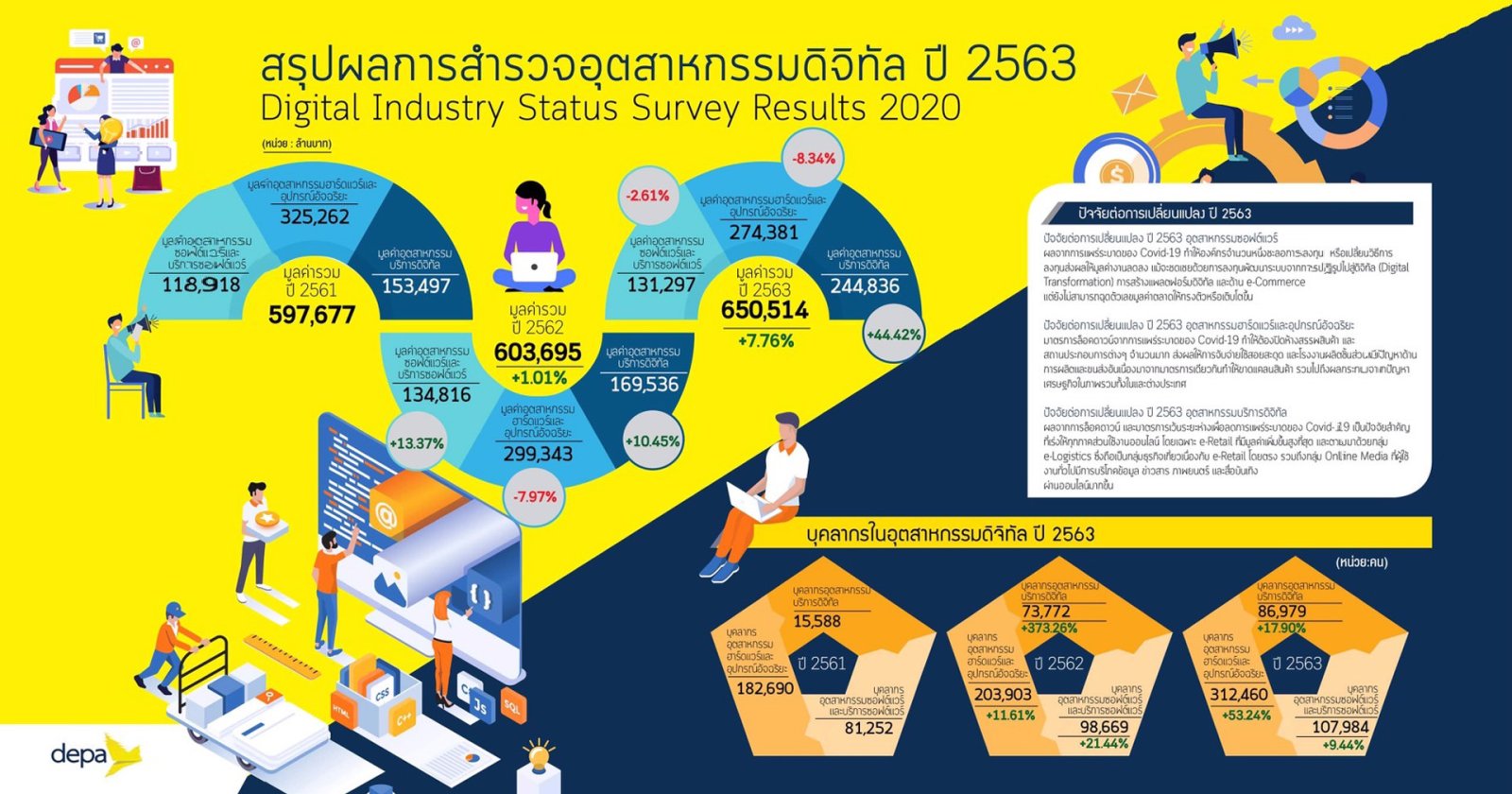 ดีป้า ร่วมกับ สถาบันไอเอ็มซี เผยผลสำรวจข้อมูลสถานภาพอุตสหากรรมดิจิทัลไทย ประจำปี 2564 ใน 3 อุตสาหกรรม ประกอบด้วย อุตสาหกรรมซอฟต์แวร์ อุตสาหกรรมฮาร์ดแวร์และอุปกรณ์อัจฉริยะ และอุตสาหกรรมบริการดิจิทัล มีมูลค่ารวม 8.98 แสนล้านบาท ขยายตัว 25% จากปี 2563 ชี้อุตสาหกรรมบริการด้านดิจิทัลมีอัตราการขยายตัวสูงที่สุด พร้อมคาดการณ์ว่า การเติบโตของแพลตฟอร์มบริการดิจิทัลจะเป็นแรงขับเคลื่อนให้อุตสาหกรรมบริการด้านดิจิทัลมีสัดส่วนมากที่สุดเมื่อเทียบกับทุกพื้นที่ในอุตสาหกรรมดิจิทัลไทย โดยมูลค่าจะขึ้นไปถึง 6.9 แสนล้านบาทในปี 256709/09/2021