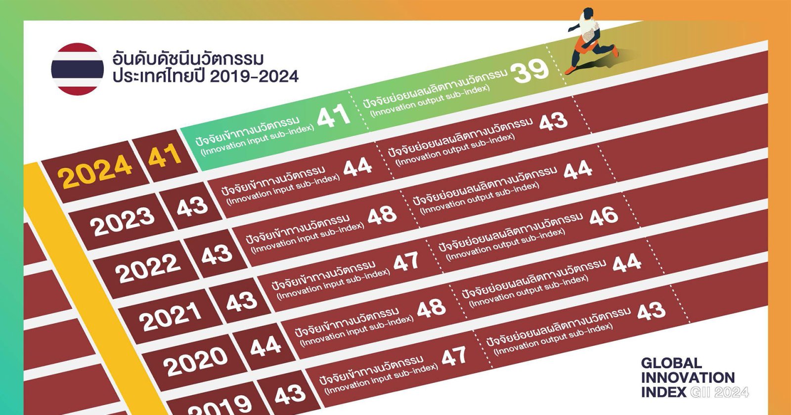 กระทรวงการอุดมศึกษา วิทยาศาสตร์ วิจัยและนวัตกรรม (อว.) โดยสำนักงานนวัตกรรมแห่งชาติ (NIA) เปิดเผยผลการจัดอันดับดัชนีนวัตกรรมโลก (Global Innovation Index 2024 หรือ GII 2024) ซึ่งจัดโดยองค์การทรัพย์สินทางปัญญาโลก (WIPO) ภายใต้ธีม “ปลดล็อกศักยภาพผู้ประกอบการเพื่อสังคม” (Unlocking the Promise of Social Entrepreneurship) ซึ่งมุ่งเน้นการขับเคลื่อนนวัตกรรมเพื่อแก้ปัญหาสังคม โดยในปีนี้ ประเทศไทยขยับอันดับขึ้นมาอยู่ที่ 41 จาก 133 ประเทศทั่วโลก เพิ่มขึ้น 2 อันดับจากปีก่อนทีมคอนเทนต์ BT | 522 days ago