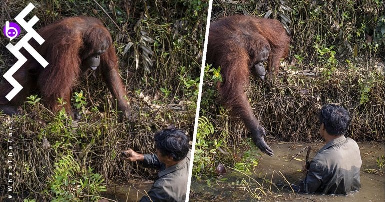 น้ำใจจากสัตว์ป่า อุรังอุตังยื่นมือแสดงเจตนาช่วยมนุษย์ขึ้นจากบ่อน้ำ
