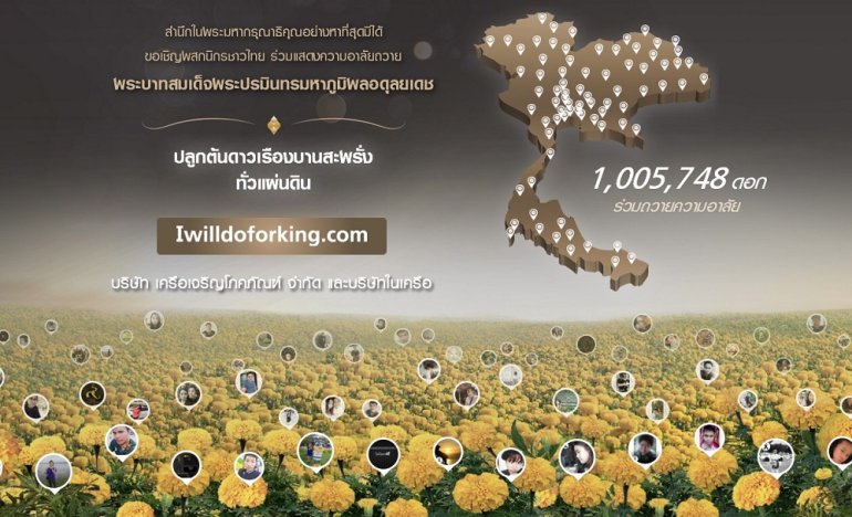 ด้วยสำนึกในพระมหากรุณาธิคุณอย่างหาที่สุดมิได้ เครือเจริญโภคภัณฑ์ และ ทรู คอร์ปอเรชั่น โดย นายศุภชัย เจียรวนนท์ ประธานคณะผู้บริหาร เครือเจริญโภคภัณฑ์ และ ประธานคณะกรรมการบริหาร บมจ.ทรู คอร์ปอเรชั่น นำคณะผู้บริหารและพนักงาน ร่วมปลูกต้นดาวเรืองให้เหลืองอร่ามบานสะพรั่งทั่วแผ่นดิน ในช่วง พระราชพิธีถวายพระเพลิงพระบรมศพ พระบาทสมเด็จพระปรมินทรมหาภูมิพลอดุลยเดช บรมนาถบพิตร ณ อาคารสำนักงานเครือทั้งในและต่างประเทศทั่วโลก พร้อมเชิญชวนพสกนิกรไทยร่วมถวายความอาลัยทางเว็บไซต์ www.iwilldoforking.com แล้วแชร์ผ่านเฟซบุ๊ค ซึ่งทุกการแชร์ ดอกดาวเรืองจะบานสะพรั่งทั่วหน้าเว็บไซต์ตลอดเดือนตุลาคมนี้ รวมถึงเปิดให้รับต้นกล้าดาวเรืองที่กลุ่มทรู จัดเตรียมไว้ จำนวน 9,999 ต้น โดยไม่เสียค่าใช้จ่าย ณ ทรูสเฟียร์ และ ทรูช้อป นอกจากนี้ กลุ่มทรู ยังได้จัดเตรียมความพร้อมด้านการสื่อสารอำนวยความสะดวกแก่ประชาชนที่เดินทางมาร่วมงาน ในช่วงพระราชพิธีอย่างเต็มที่ โดยทรูมูฟ เอช ได้เตรียมการปรับเพิ่มทั้งเสาส่งสัญญาณและอุปกรณ์กระจายสัญญาณ ณ บริเวณท้องสนามหลวงพระเมรุมาศจำลอง และจุดถวายดอกไม้จันทน์ทั่วประเทศ เพื่อรองรับการใช้งานทั้งการโทรเข้า-ออก และการใช้ดาต้าผ่าน 4G และ WiFi by TrueMove H…salinee tintumrong | 3028 days ago